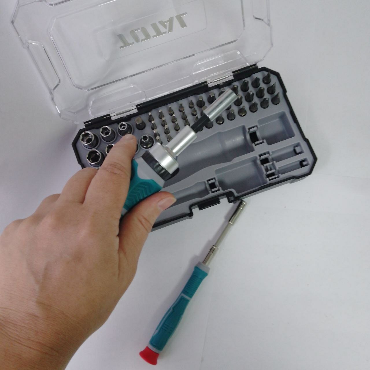Купить Отвертка TOTAL, реверсивная, с насадками, магнитные наконечники, 55 элементов, в кейсе, 2 цвета