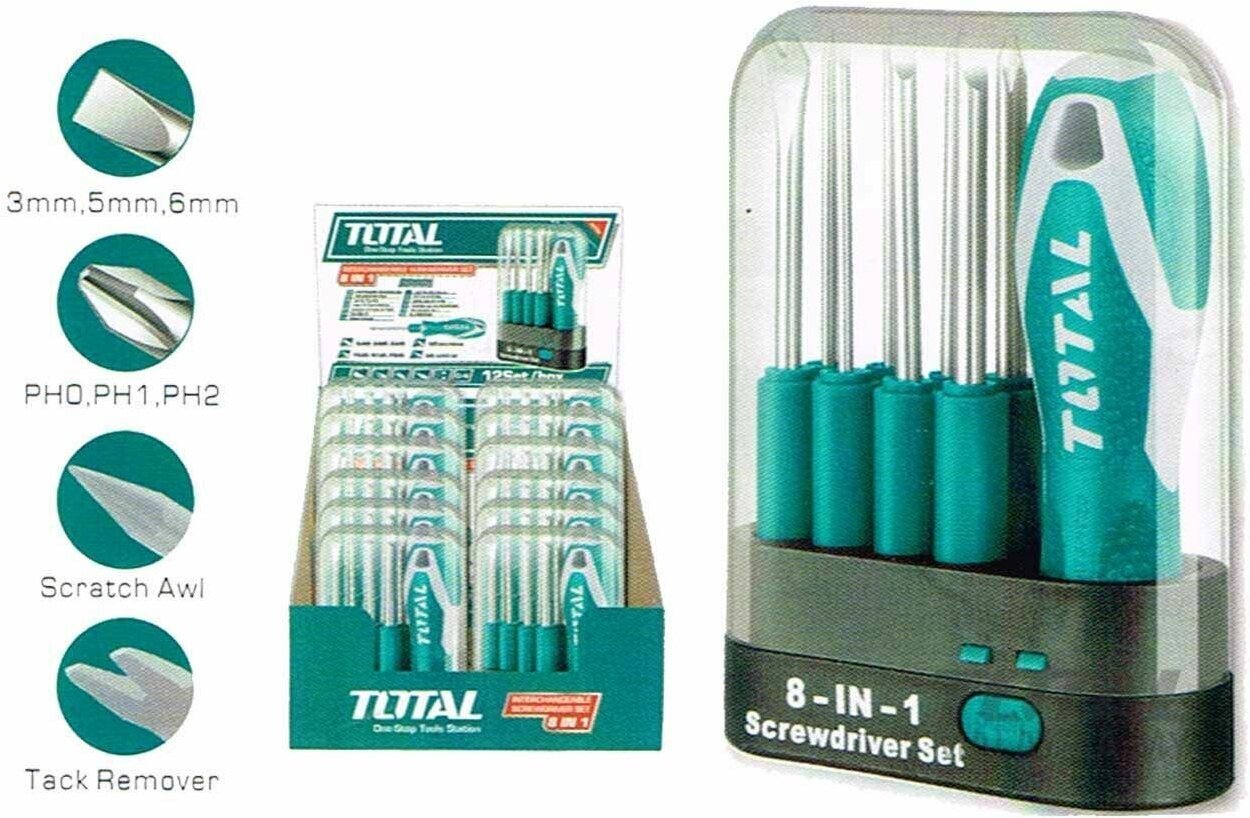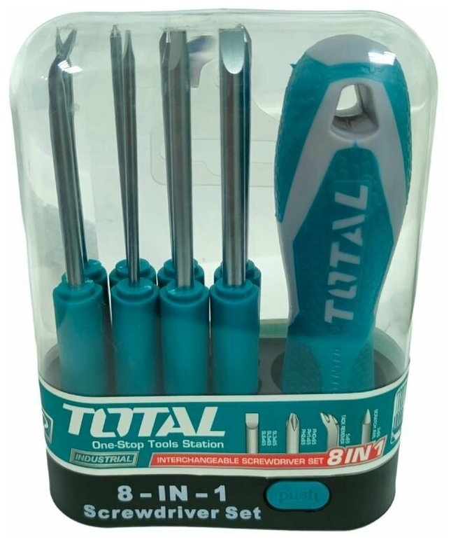 Купить Отвертка TOTAL, 8в1, со сменными битами, магнитный наконечник, в кейсе, бирюзовая