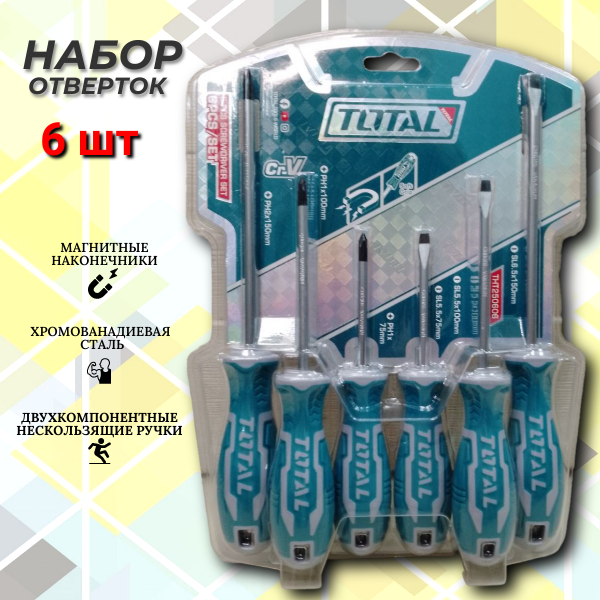 Купить Набор отверток TOTAL, магнитный наконечник, эргономичные головки, 6 штук