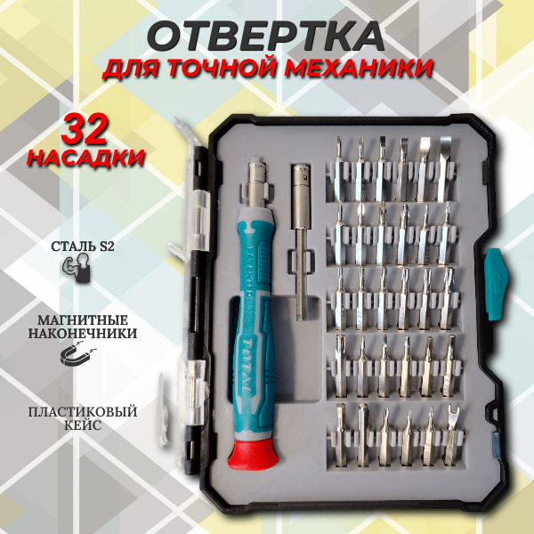 Отвертка TOTAL, с битами, реверсивная, магнитная, 32 предмета интересное: