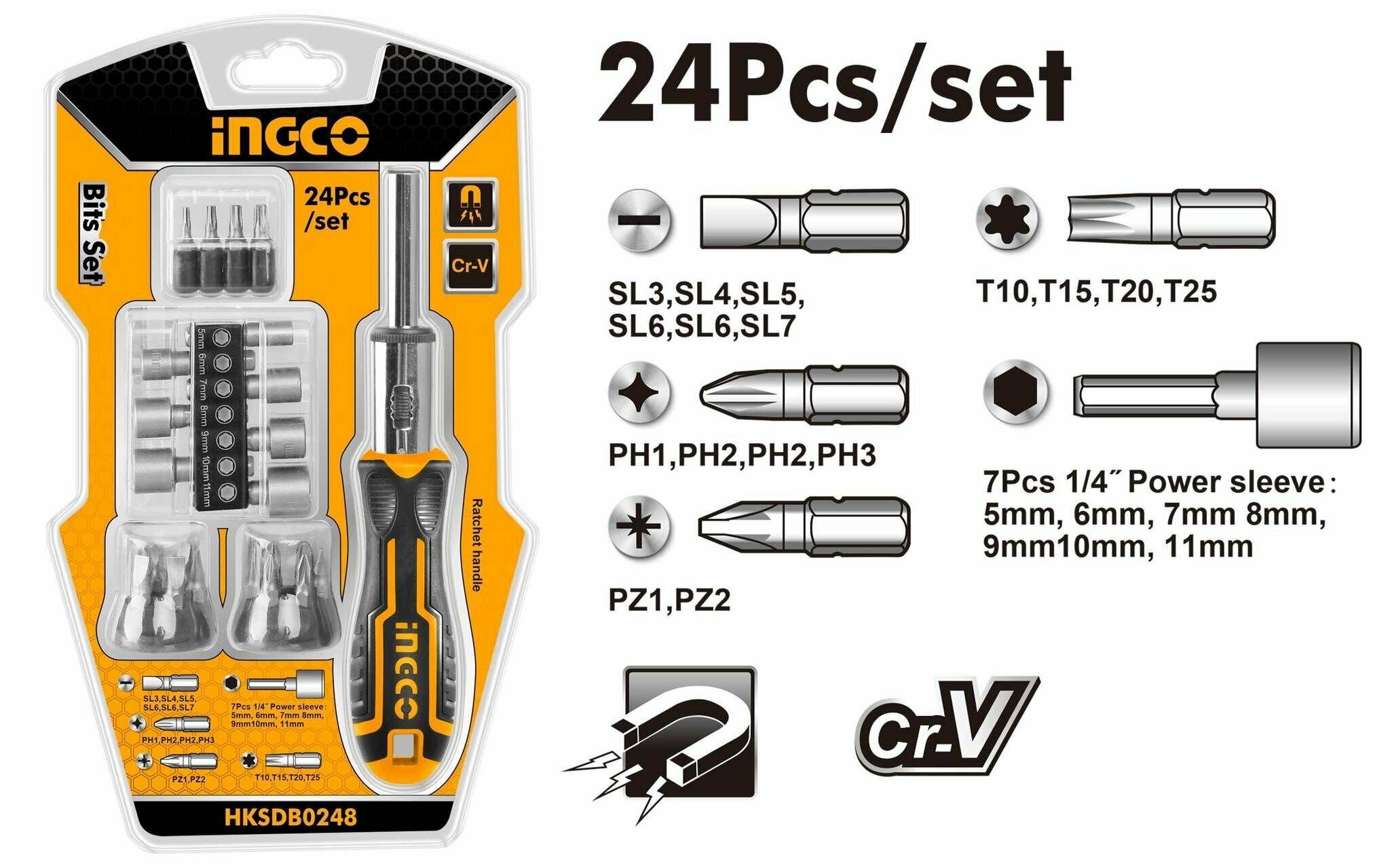 Отвертка 24в1 INGCO HKSDB0248 INDUSTRIAL, 16 бит 6,35х25мм, 7 головок 1/4", Cr-V_MOD интересное: