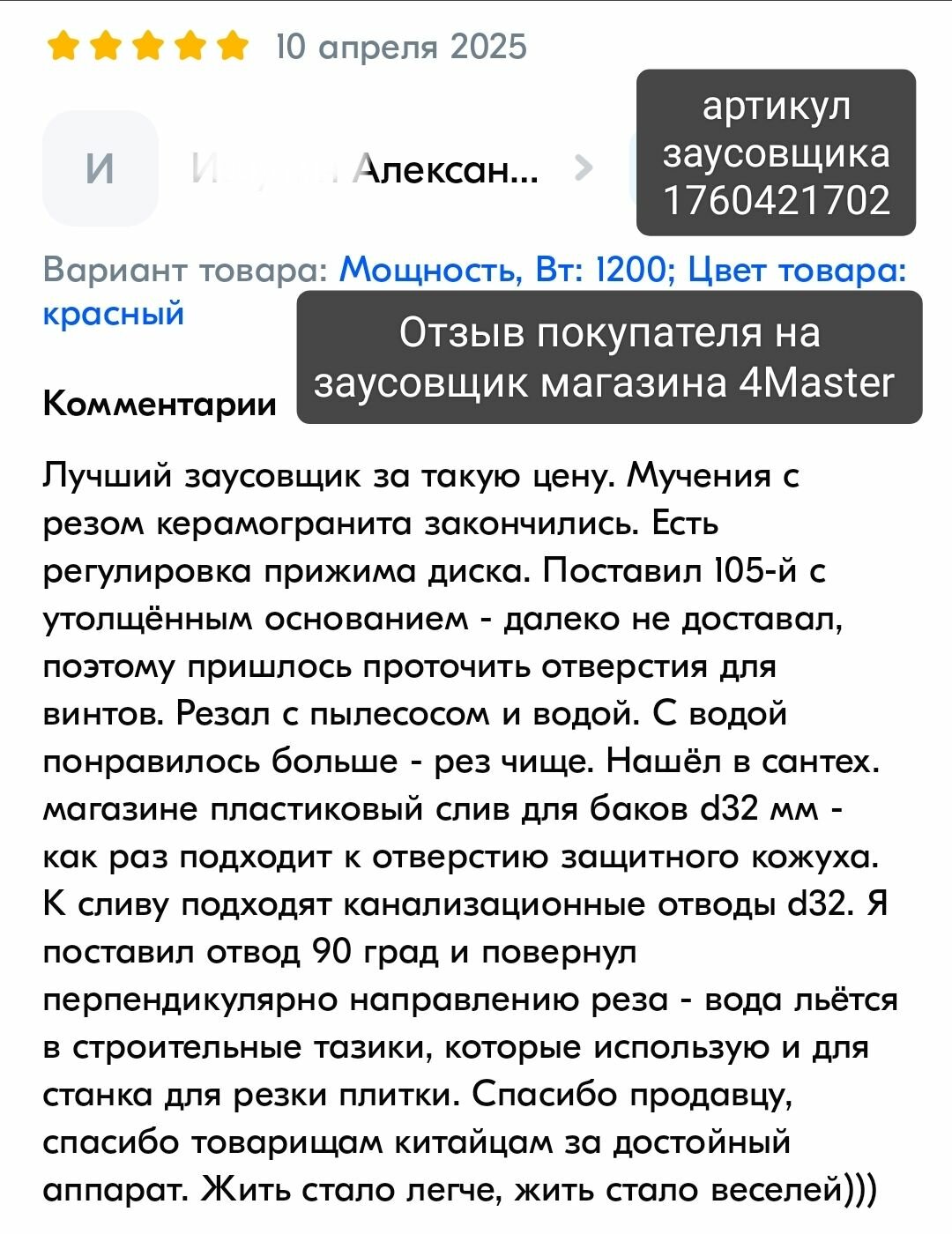 Ниже Вы можете прочитать отзывы на Плиткорез электрический для запила плитки под 45 градусов / заусовщик, ознакомится с подробными характеристиками, посмотреть интересные обзоры и фотографии на Плиткорез электрический для запила плитки под 45 градусов / заусовщик.