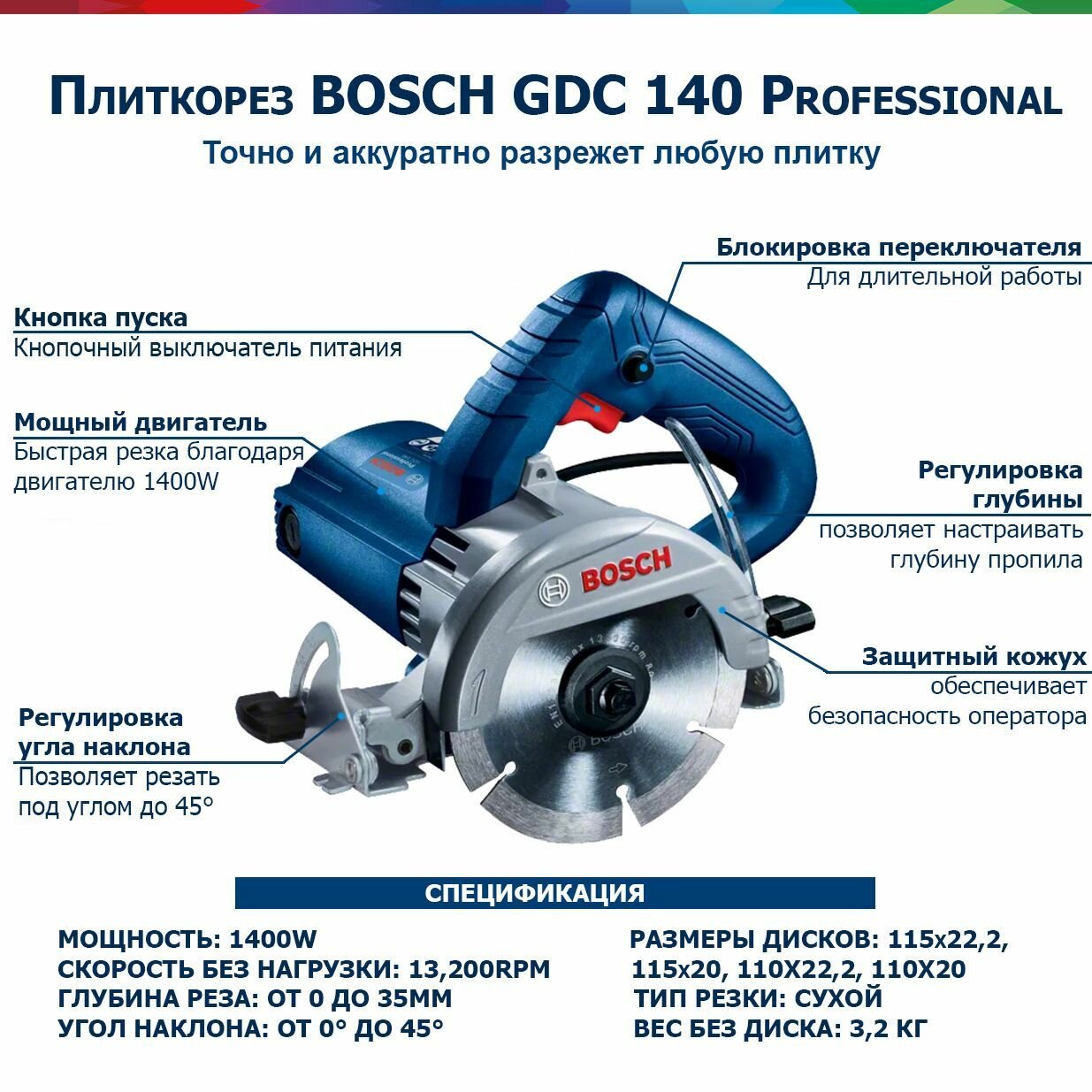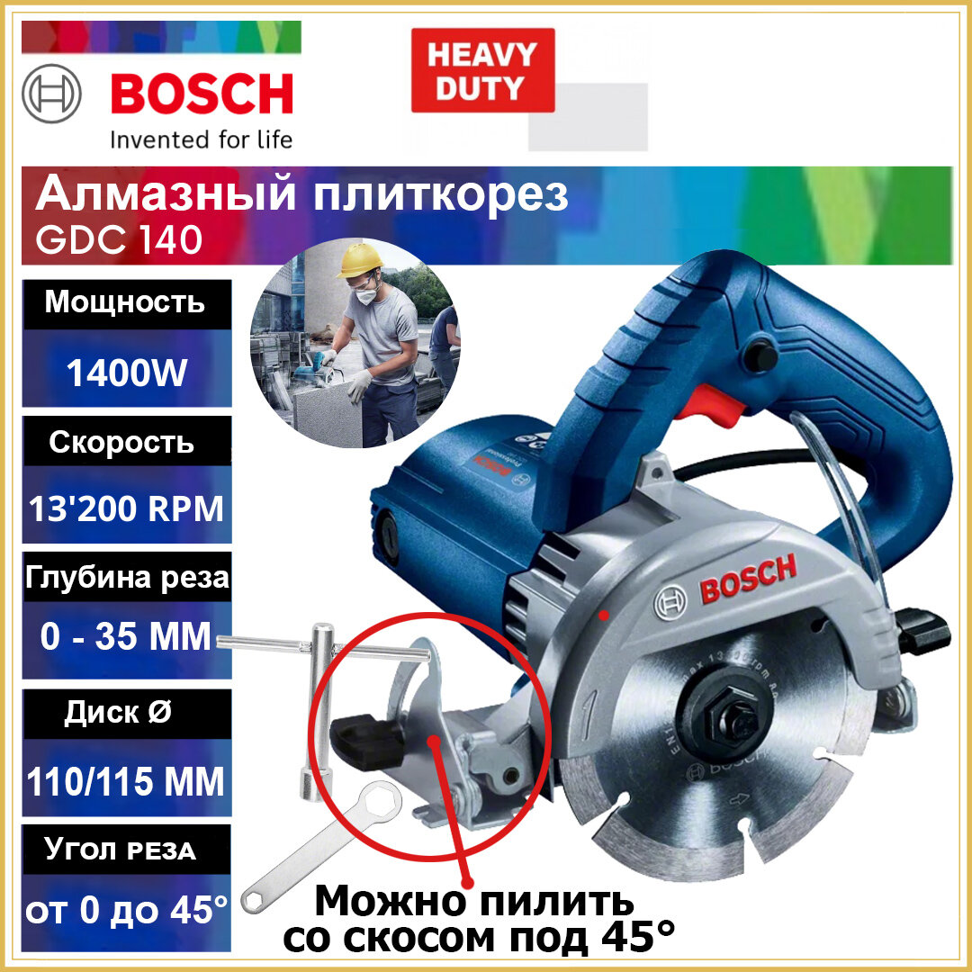 Ниже Вы можете прочитать отзывы на Плиткорез Bosch GDC 140 Prof (диски 115 мм, 1400 Вт, косой пил, рез до 35 мм), без диска, ознакомится с подробными характеристиками, посмотреть интересные обзоры и фотографии на Плиткорез Bosch GDC 140 Prof (диски 115 мм, 1400 Вт, косой пил, рез до 35 мм), без диска.