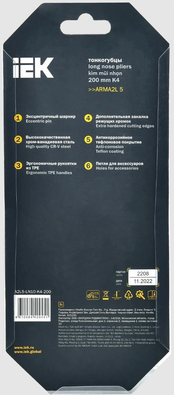 Тонкогубцы 200мм K4 ARMA2L 5 IEK A2L5-LN10-K4-200 интересное: