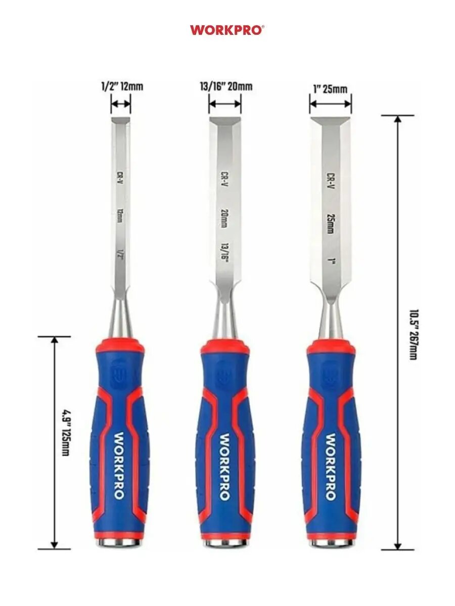Набор стамесок по дереву 3 шт 25, 19, 12 мм WP201300, WORKPRO #WP201300