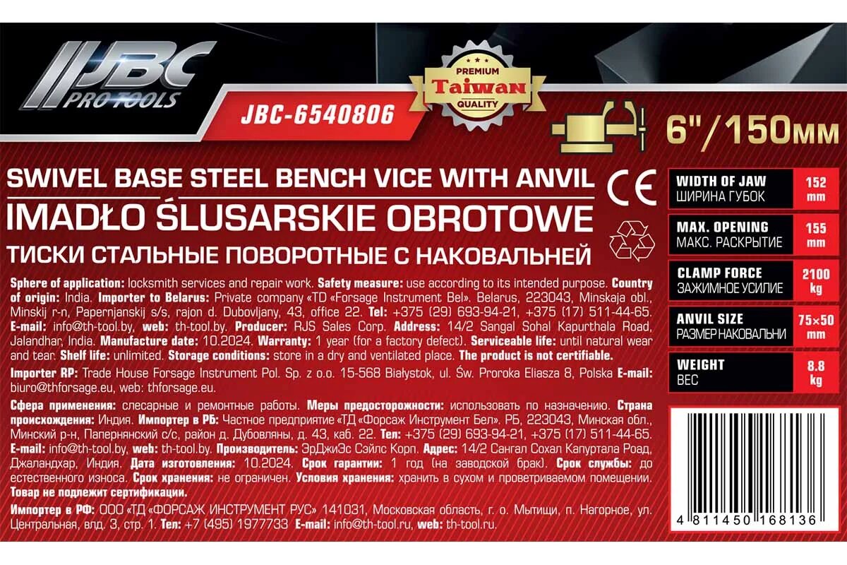 JBC Тиски стальные поворотные с наковальней 150 мм 6" JBC-6540806(62034) интересное:
