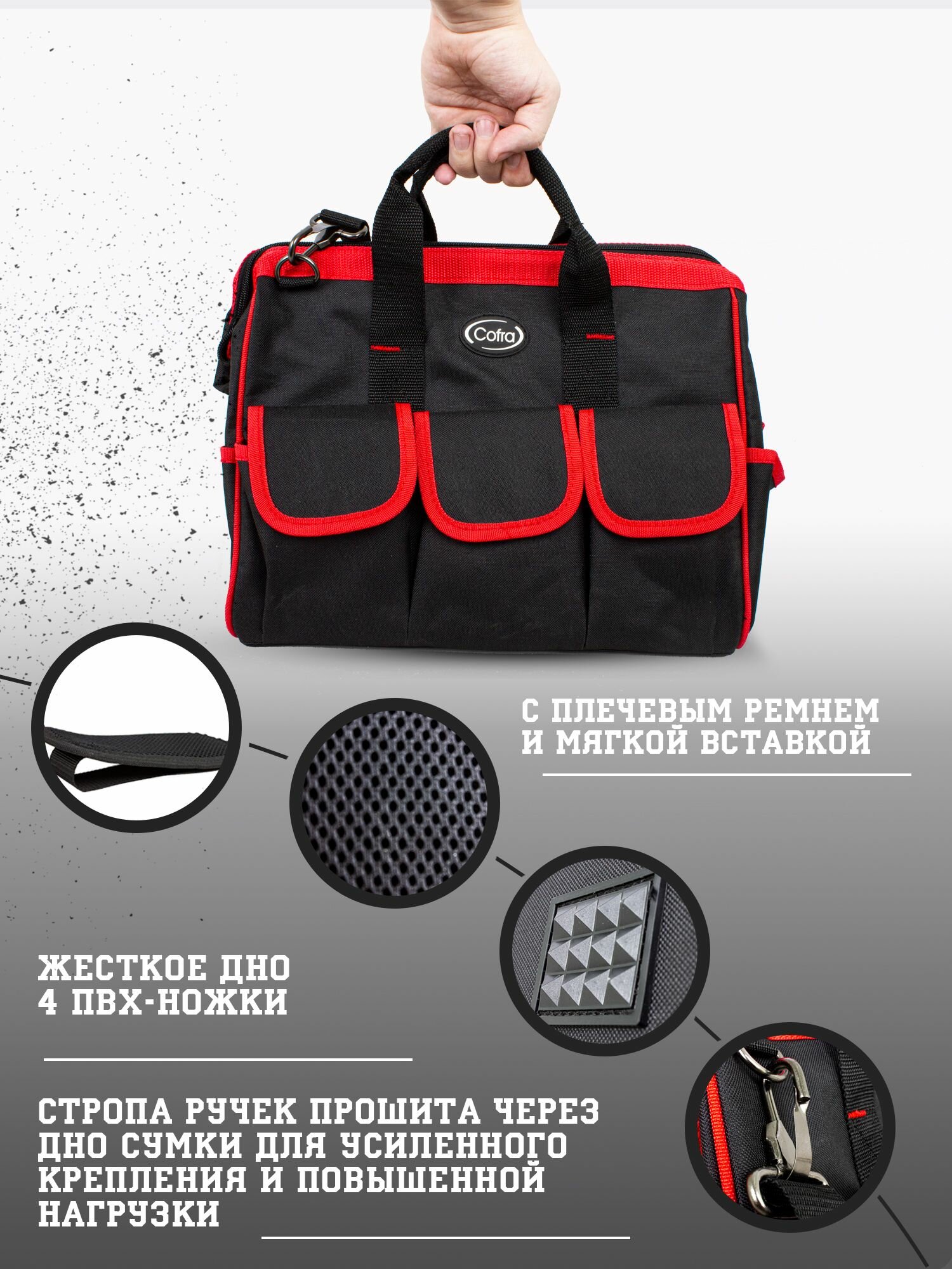 Сумка для инструментов строительная с жестким дном и металлической фурнитурой, бренд Cofra, арт. TC-4220WR интересное: