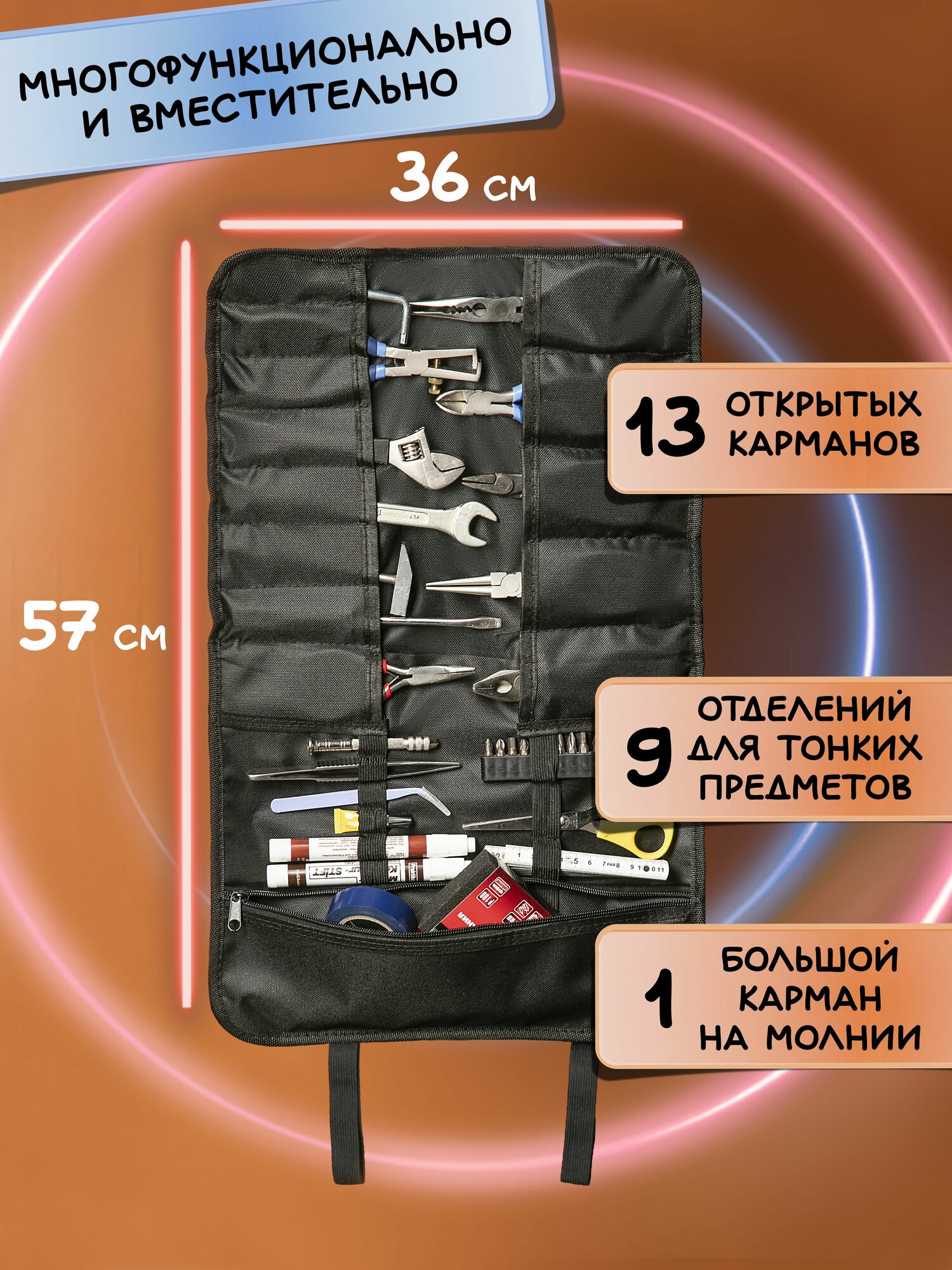 Купить Сумка скрутка для инструмента в авто 57*36 см 13 карманов и 10 отделений, органайзер для инструментов и мелочей