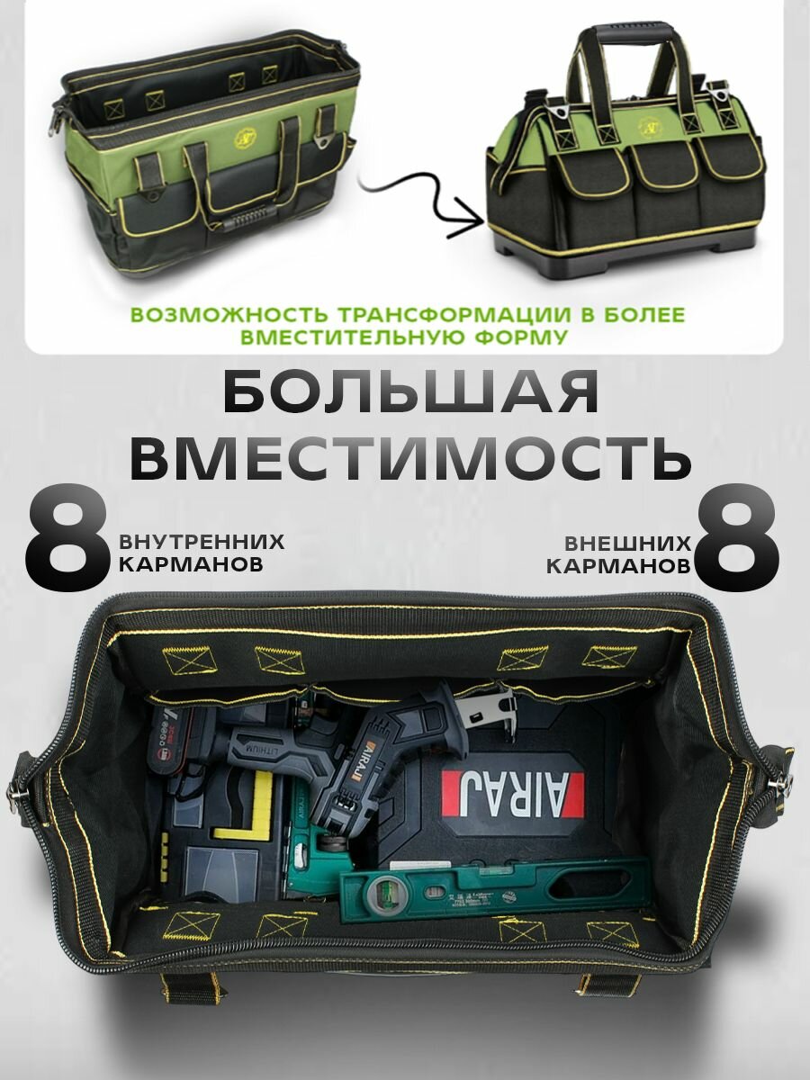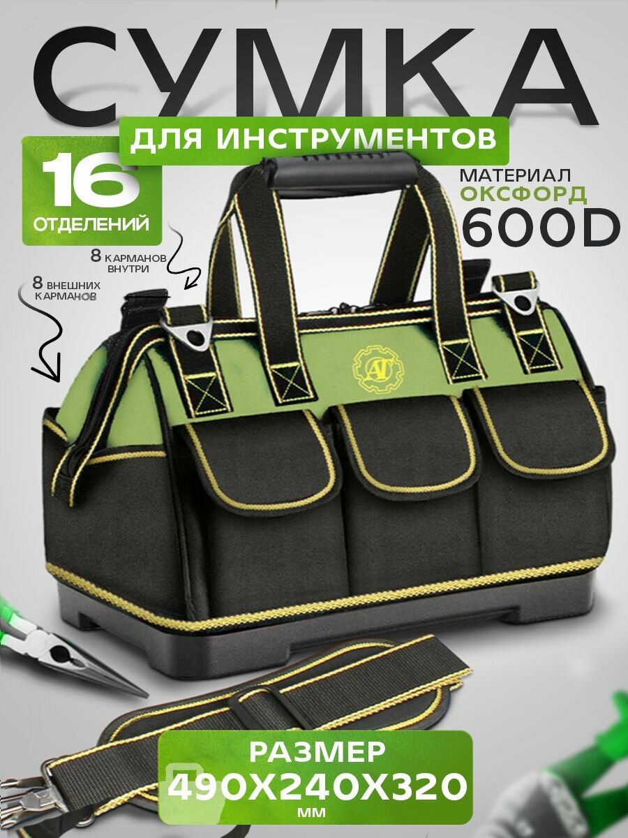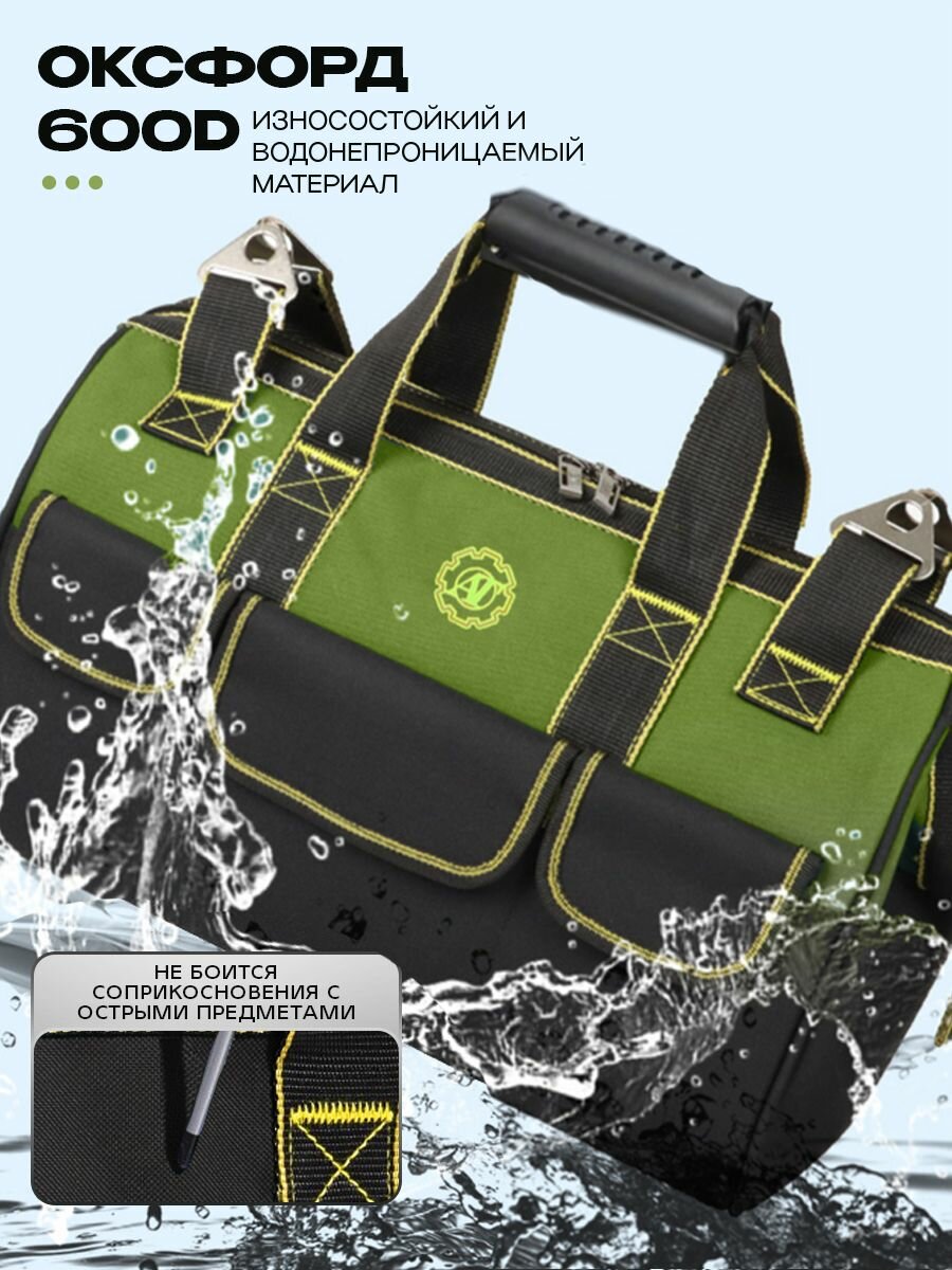 Сумка для инструмента 410х230х300 мм, строительная сумка 17 отделений, цвет чёрно-зелёный