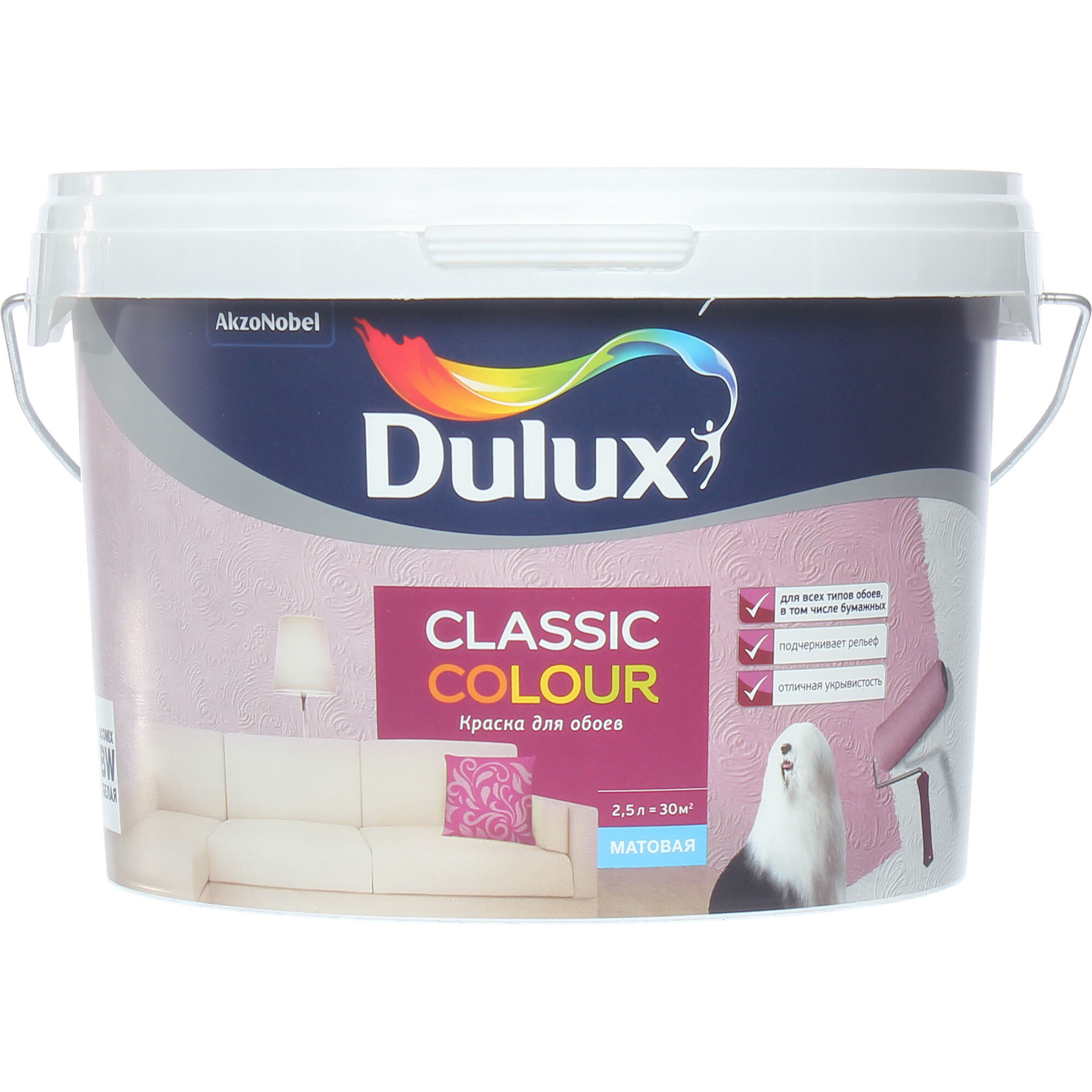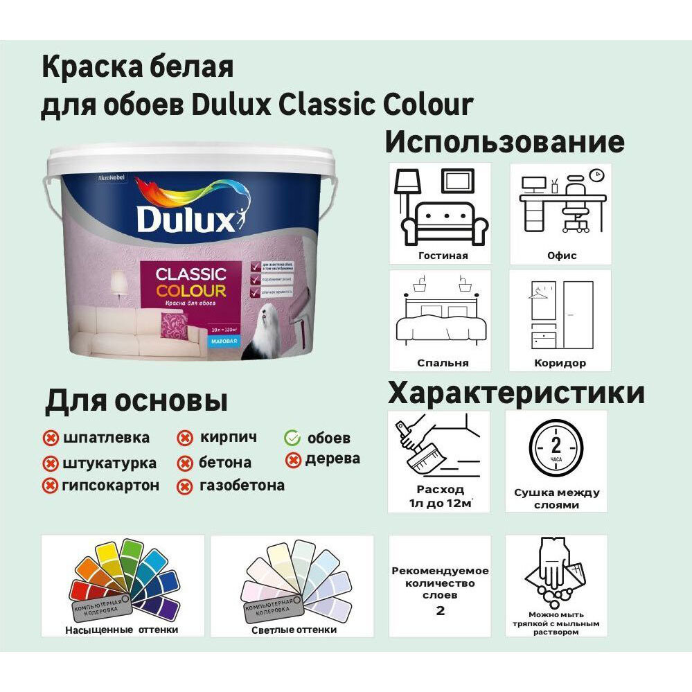 Краска акриловая Dulux Classic Colour для обоев моющаяся матовая белый 2.5 л