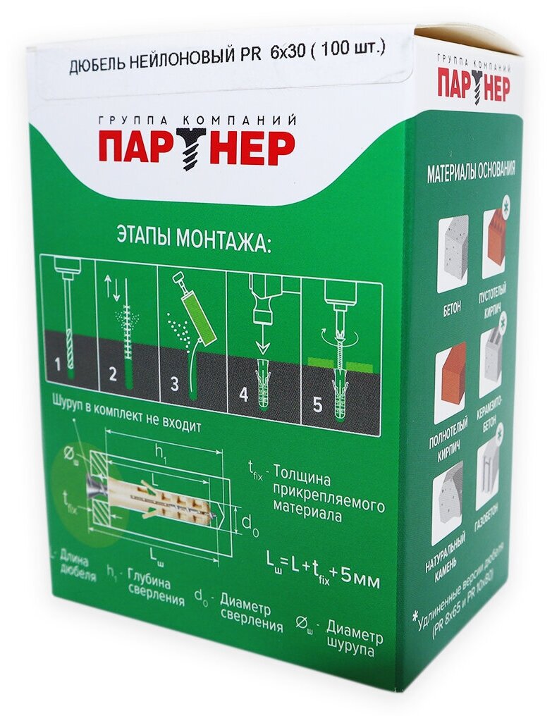 Дюбель нейлоновый партнер PR 6x30 (100 шт.) для полнотелых материалов основания
