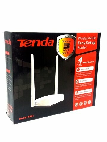 Tenda N301 Wi-Fi роутер N300, до 300 Мбит/с на 2,4 ГГц, LAN 3x100 Мбит/с, WAN 1x100 Мбит/с, 2х5dBi антенны, белый корпус