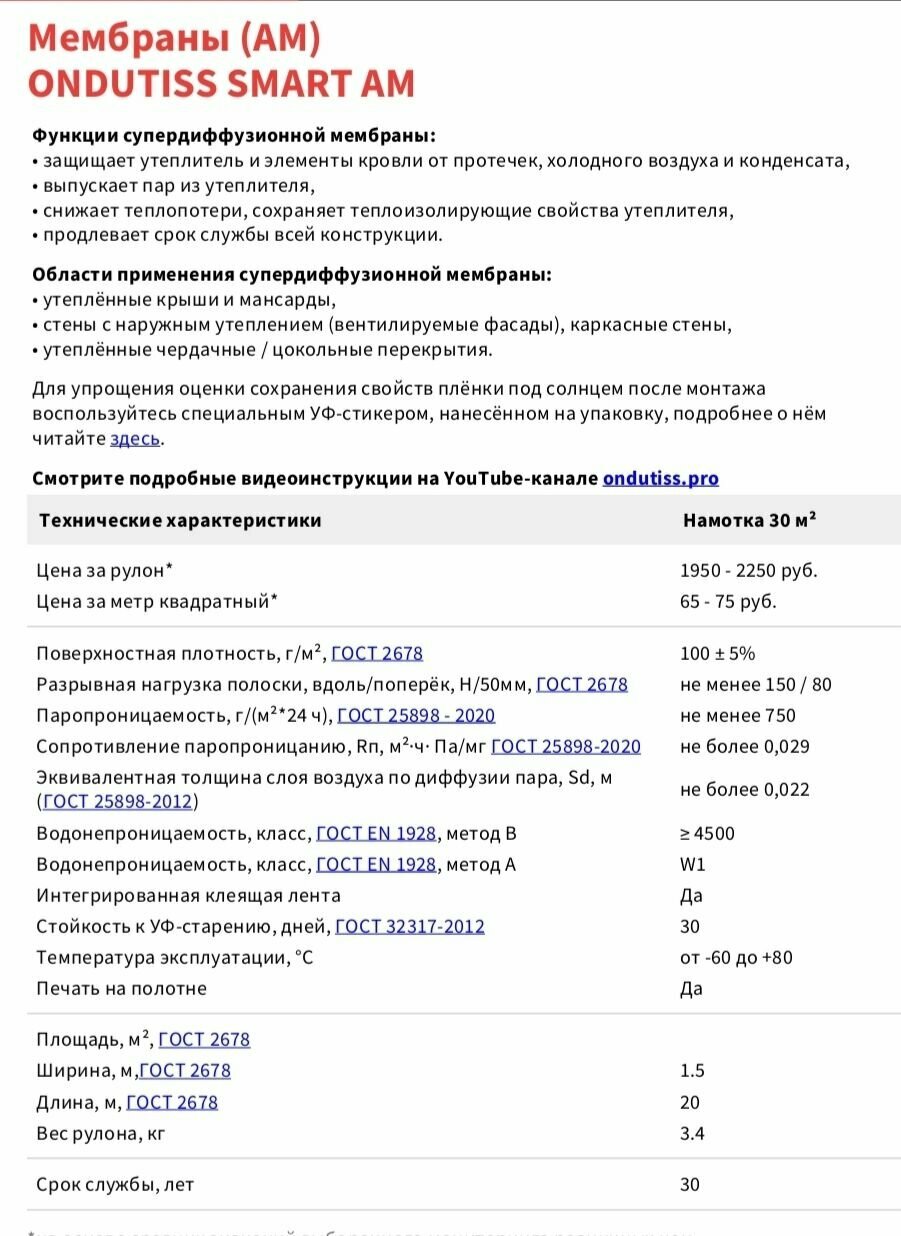 Супердифузная мембрана ONDUTISS SMART AM 30 м2 / Гидро-ветрозащитная мембрана Ондутис Смарт АМ интересное: