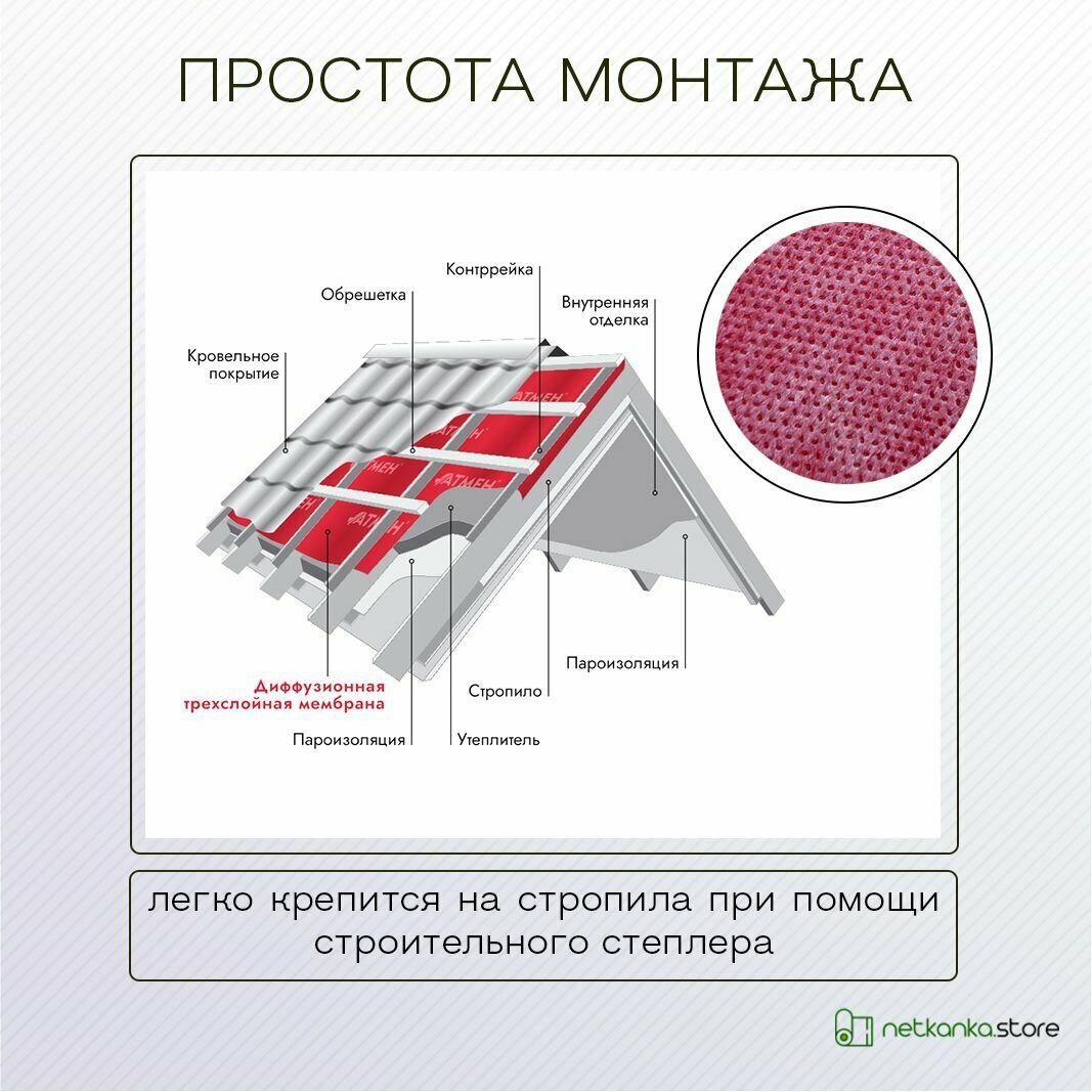 Диффузионная мембрана Атмен Standart 120 (1,6м*43,75м; 70м2) с УФ стабилизатором трехслойная гидро-ветрозащита для кровли, для стен, для перекрытий интересное: