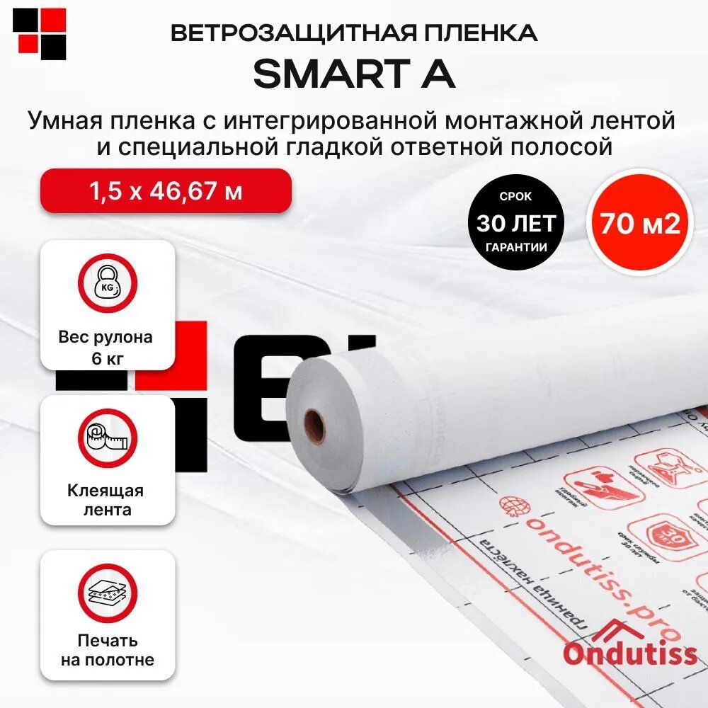 Ветрозащитная пленка ONDUTISS SMART A 70 м2 с клейкой лентой / Ветрозащита Ондутис Смарт А 70 м2 с клейкой лентой интересное: