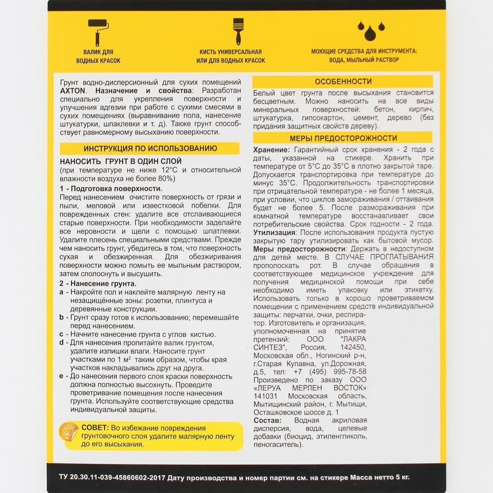 Акстон грунтовка для сухих помещений (5л) / AXTON грунт при отделке сухими строительными смесями для сухих помещений (5л) интересное: