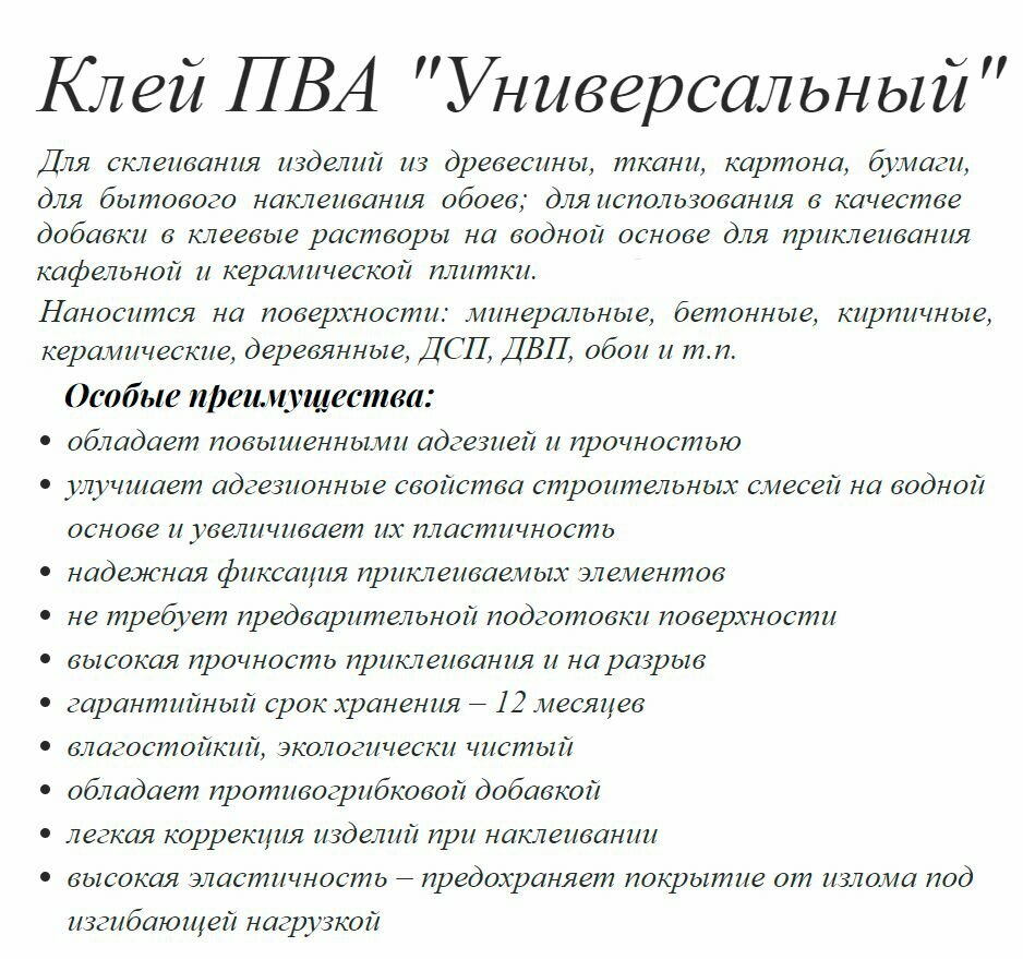 Ниже Вы можете прочитать отзывы на Клей ПВА Универсальный Master Klein 2.8 кг / повышенная адгезия и прочность, противогрибковая добавка, ознакомится с подробными характеристиками, посмотреть интересные обзоры и фотографии на Клей ПВА Универсальный Master Klein 2.8 кг / повышенная адгезия и прочность, противогрибковая добавка.