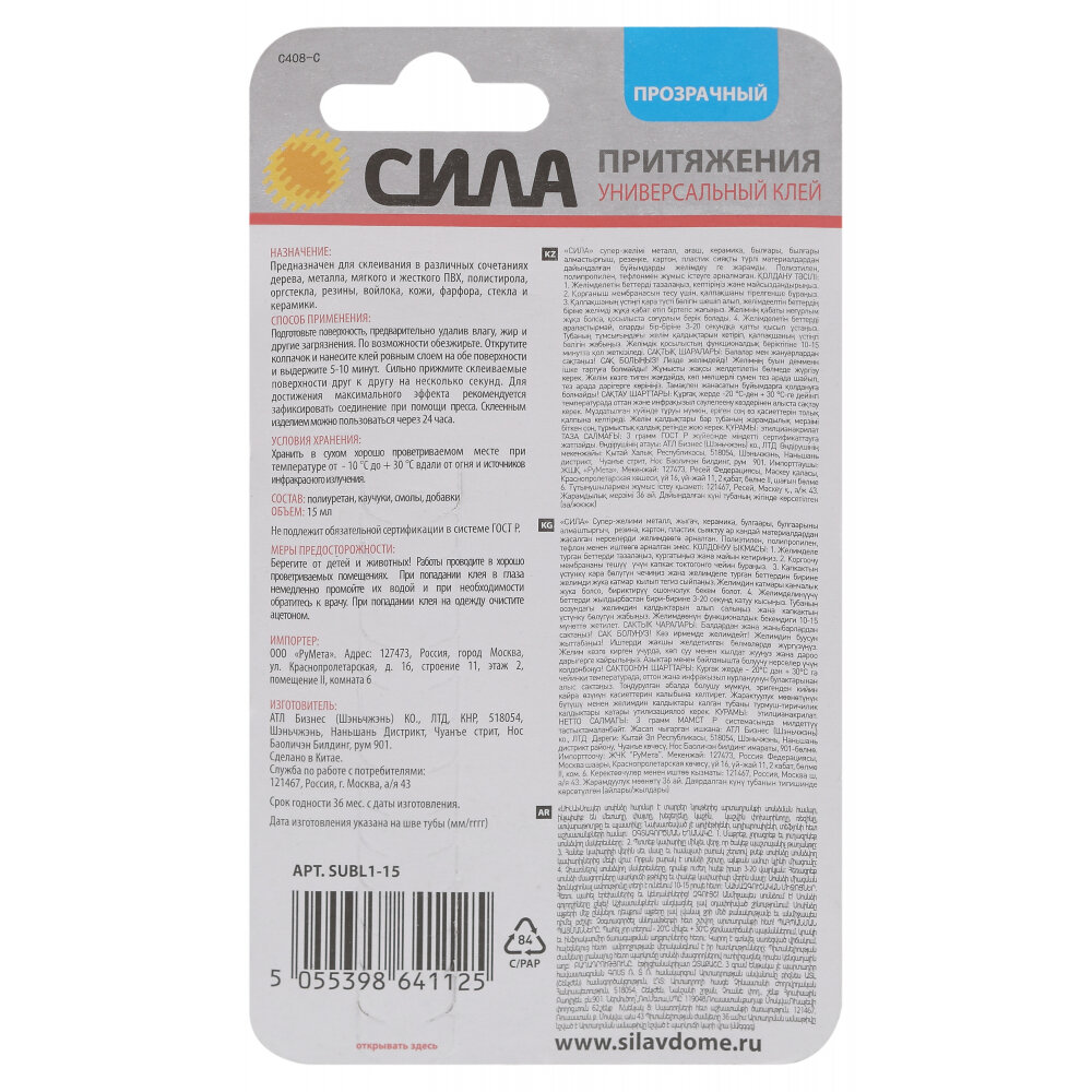 Универсальный клей сила кристалл SUBL1-15 прозрачный 15 мл контактный, полиуретановый, прозрачный интересное: