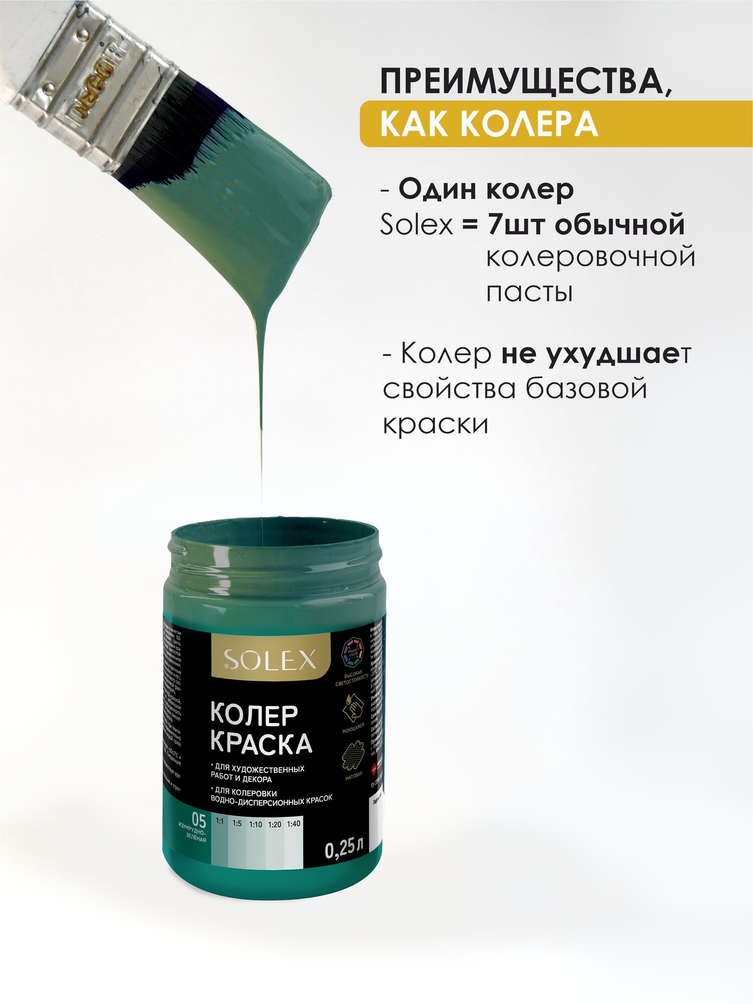 Ниже Вы можете прочитать отзывы на Краска колеровочная SOLEX изумрудно-зеленый 0,25л банка ПЭТ, ознакомится с подробными характеристиками, посмотреть интересные обзоры и фотографии на Краска колеровочная SOLEX изумрудно-зеленый 0,25л банка ПЭТ.