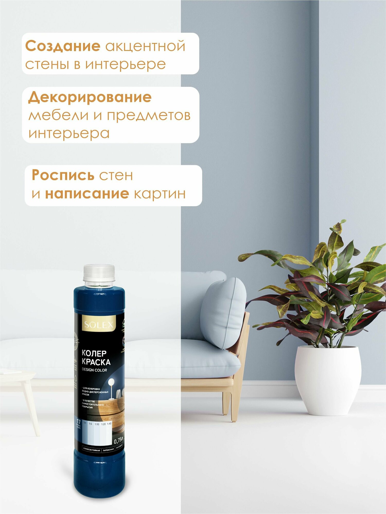 Краска колеровочная SOLEX синий 0,75л бутылка ПЭТ
