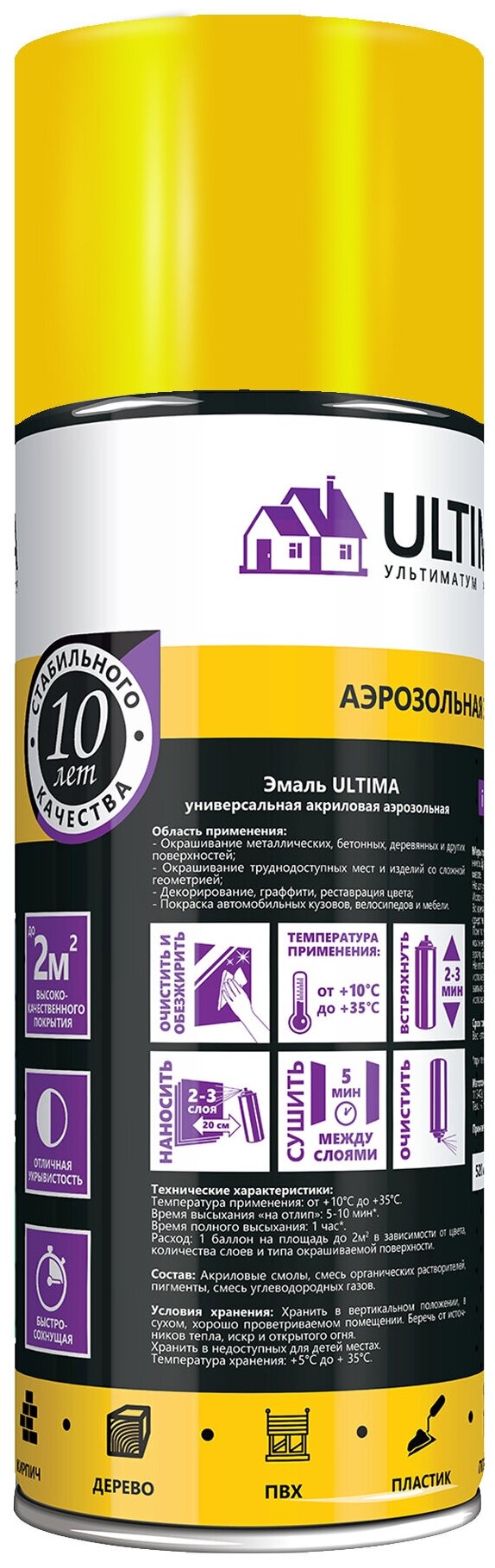 Ниже Вы можете прочитать отзывы на Эмаль аэрозольная ULTIMA ULT016 RAL 1018, акриловая, универсальная, желтый, 520 мл, ознакомится с подробными характеристиками, посмотреть интересные обзоры и фотографии на Эмаль аэрозольная ULTIMA ULT016 RAL 1018, акриловая, универсальная, желтый, 520 мл.