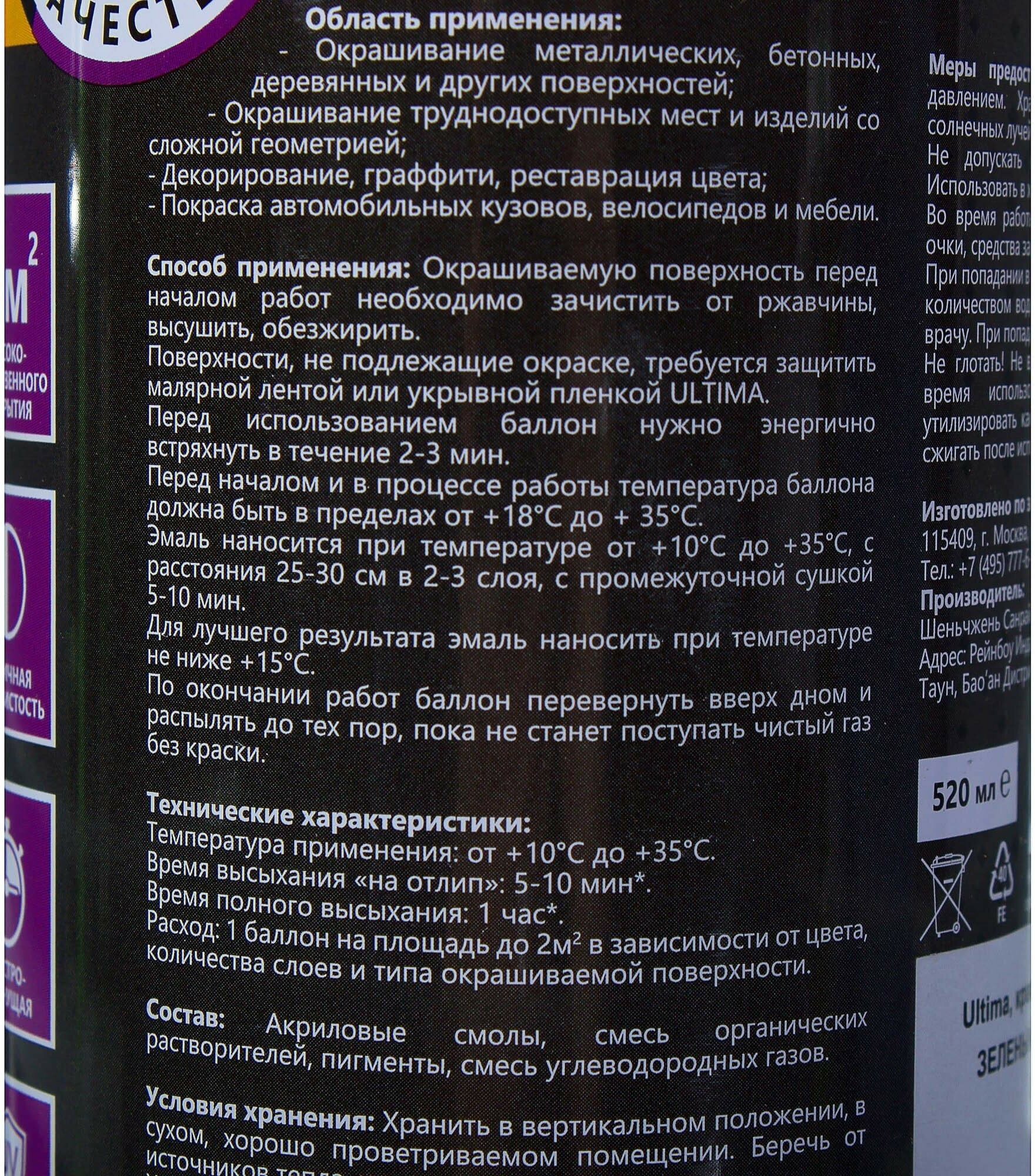 Ниже Вы можете прочитать отзывы на Эмаль аэрозольная ULTIMA ULT033 RAL 6005, акриловая, универсальная, зеленый мох, 520 мл, ознакомится с подробными характеристиками, посмотреть интересные обзоры и фотографии на Эмаль аэрозольная ULTIMA ULT033 RAL 6005, акриловая, универсальная, зеленый мох, 520 мл.