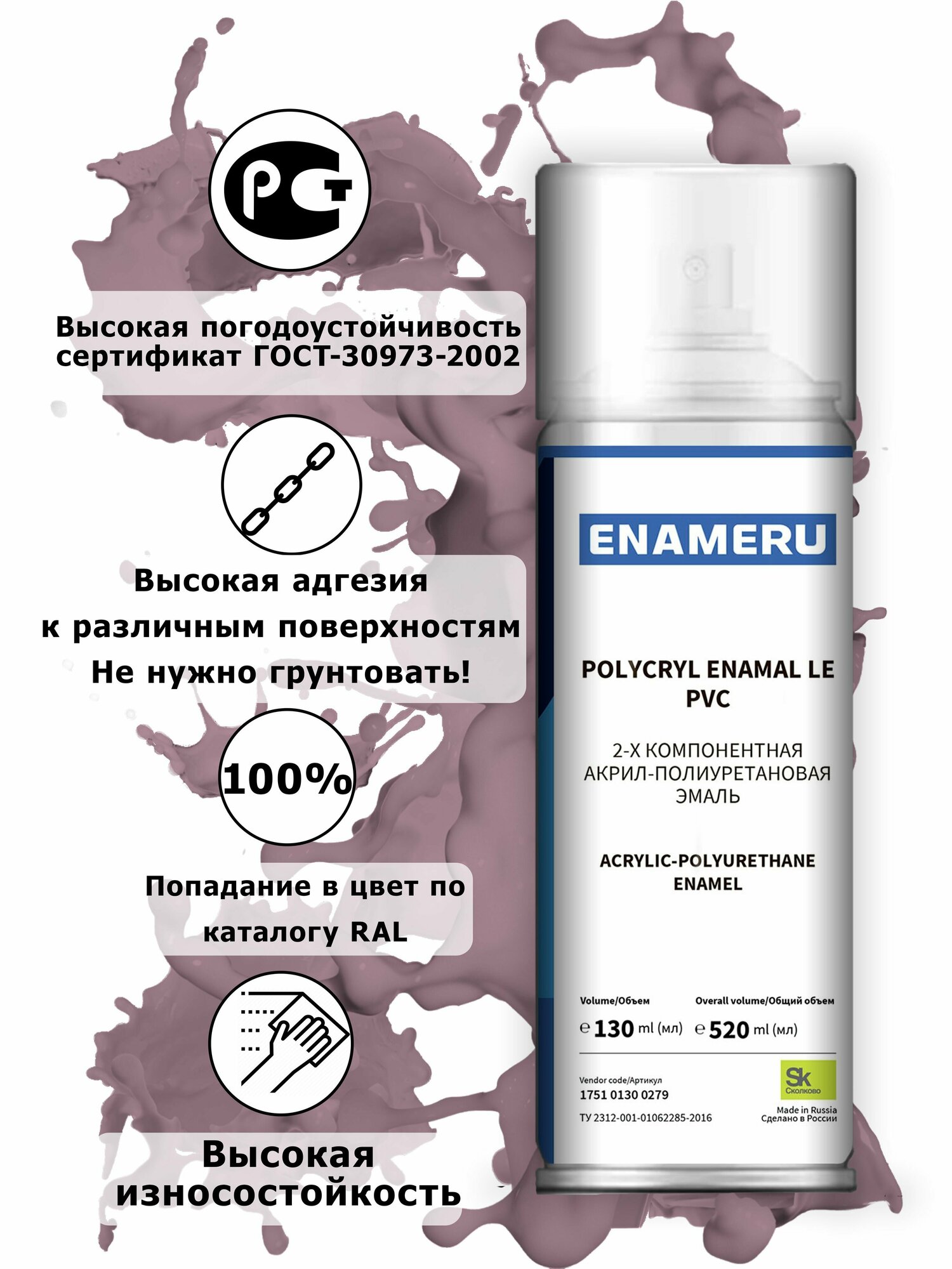 Аэрозольная краска для Стекла, Керамики Энамеру, Акрил-полиуретановая, Полуматовая, Красно-сиреневый RAL 4001, 0.52л