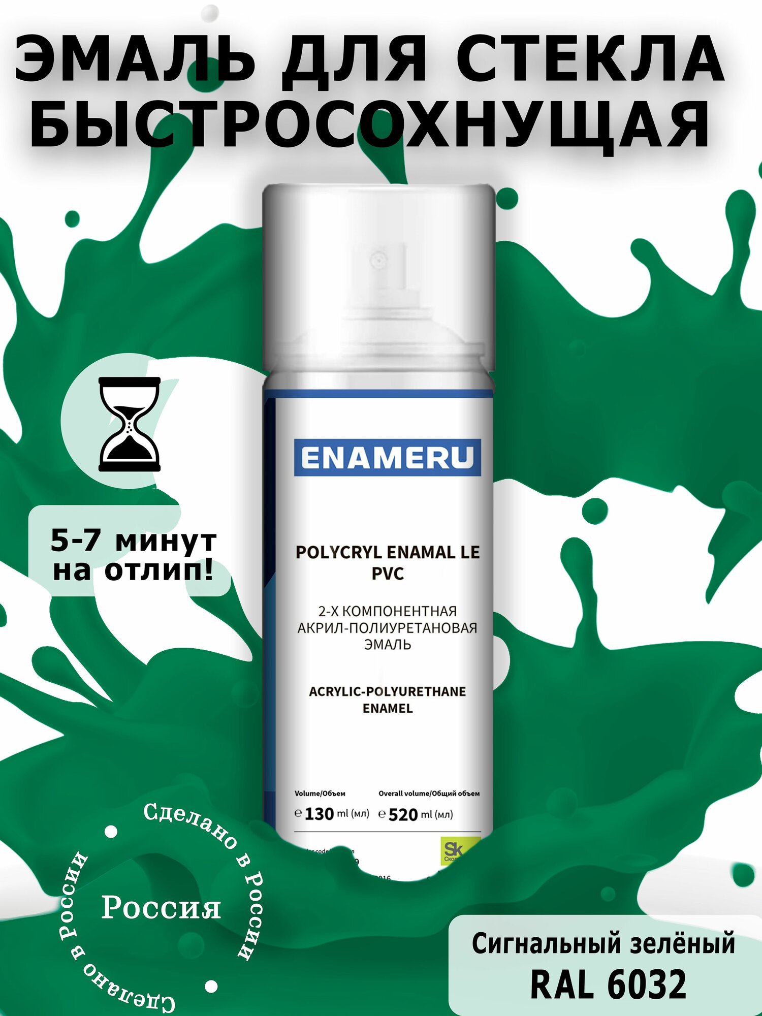 Аэрозольная краска для Стекла, Керамики Энамеру, Акрил-полиуретановая, Полуматовая, Транспортный зеленый RAL 6024, 0.52л
