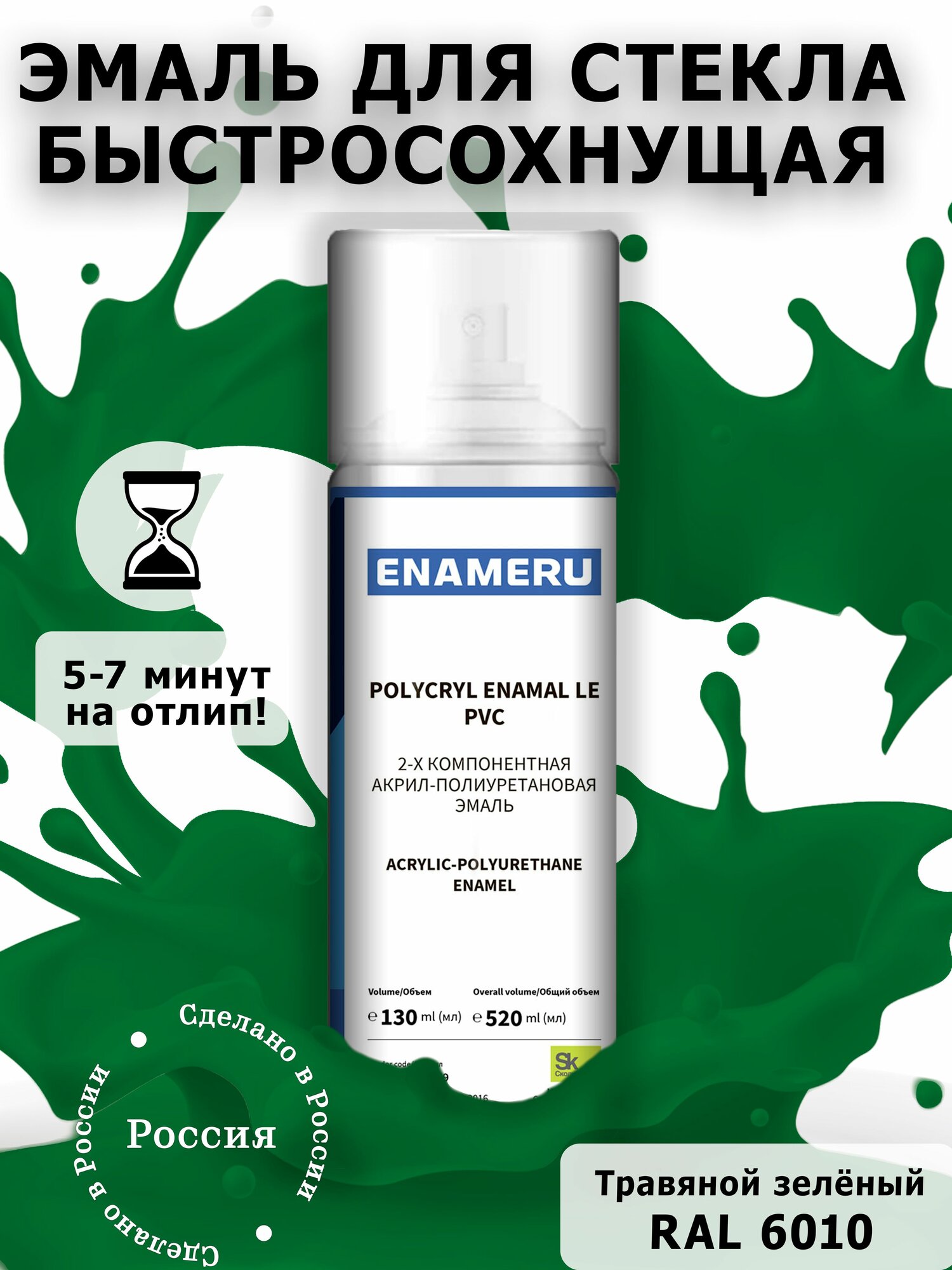 Аэрозольная краска для Стекла, Керамики Энамеру, Акрил-полиуретановая, Полуматовая, Сигнальный зеленый RAL 6032, 0.52л