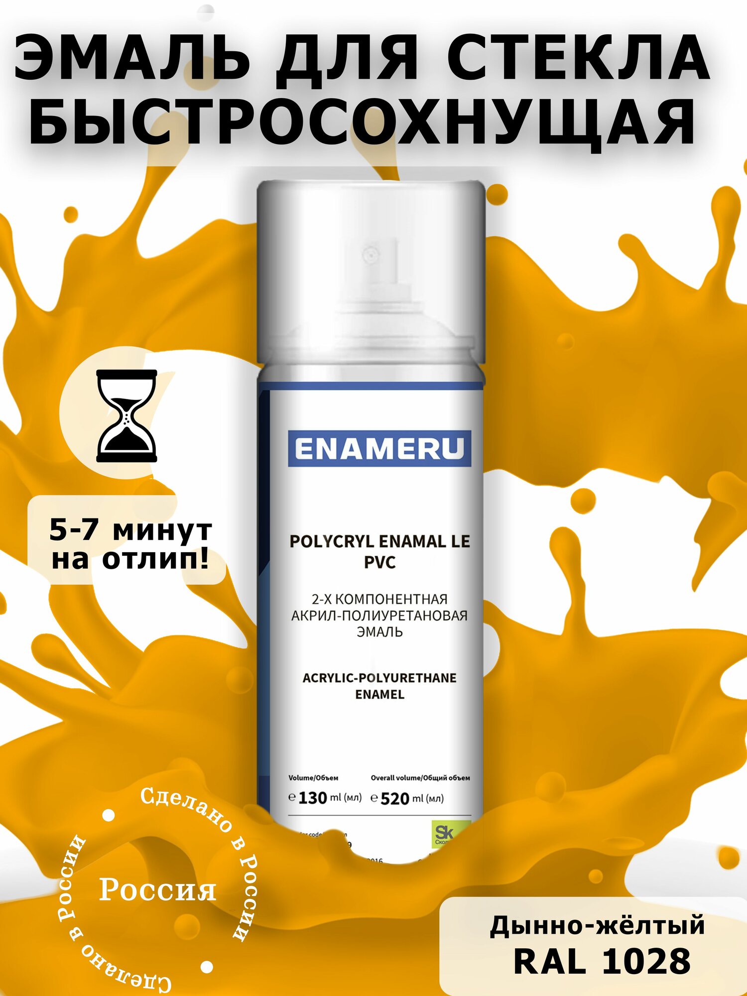 Аэрозольная краска для Стекла, Керамики Энамеру, Акрил-полиуретановая, Полуматовая, Солнечно-жёлтый RAL 1037, 0.52л