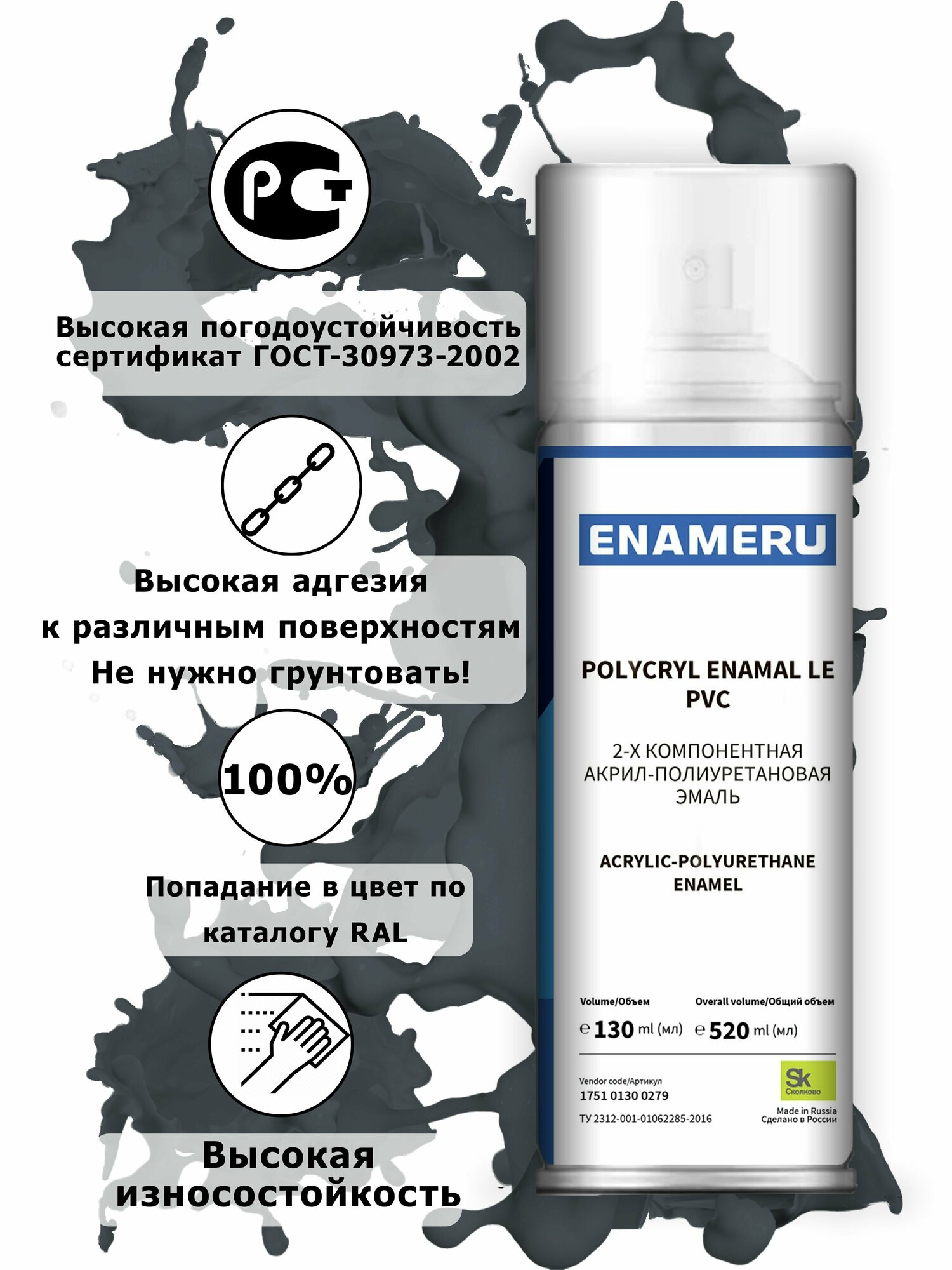 Аэрозольная краска для Стекла, Керамики Энамеру, Акрил-полиуретановая, Полуматовая, Гранитовый серый RAL 7026, 0.52л