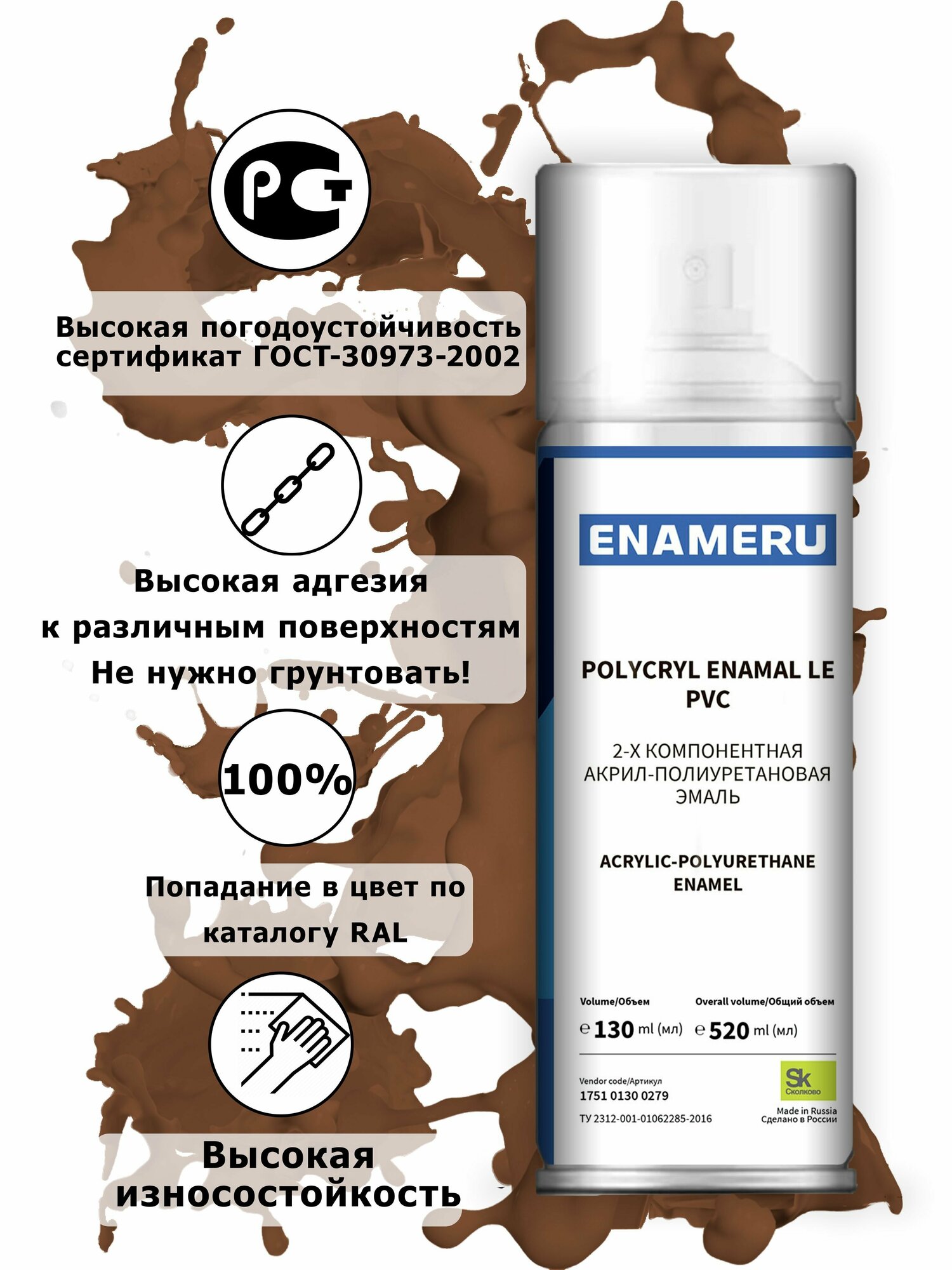 Аэрозольная краска для Стекла, Керамики Энамеру, Акрил-полиуретановая, Полуматовая, Сигнальный коричневый RAL 8002, 0.52л