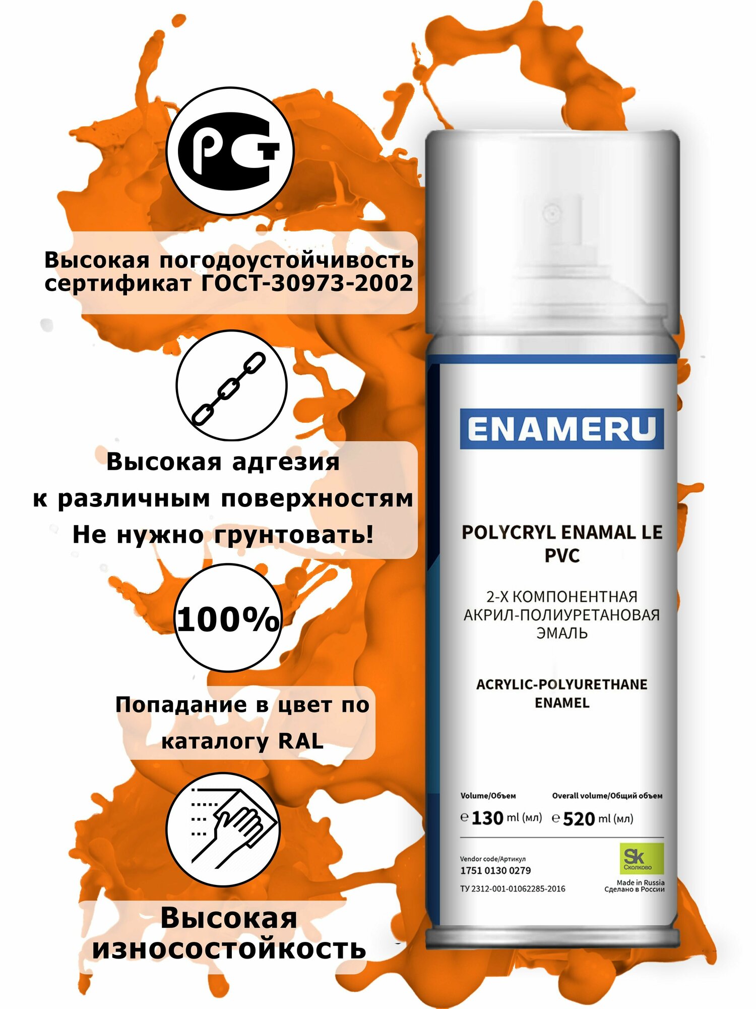 Аэрозольная краска для Стекла, Керамики Энамеру, Акрил-полиуретановая, Полуматовая, Оранжевый RAL 2004, 0.52л