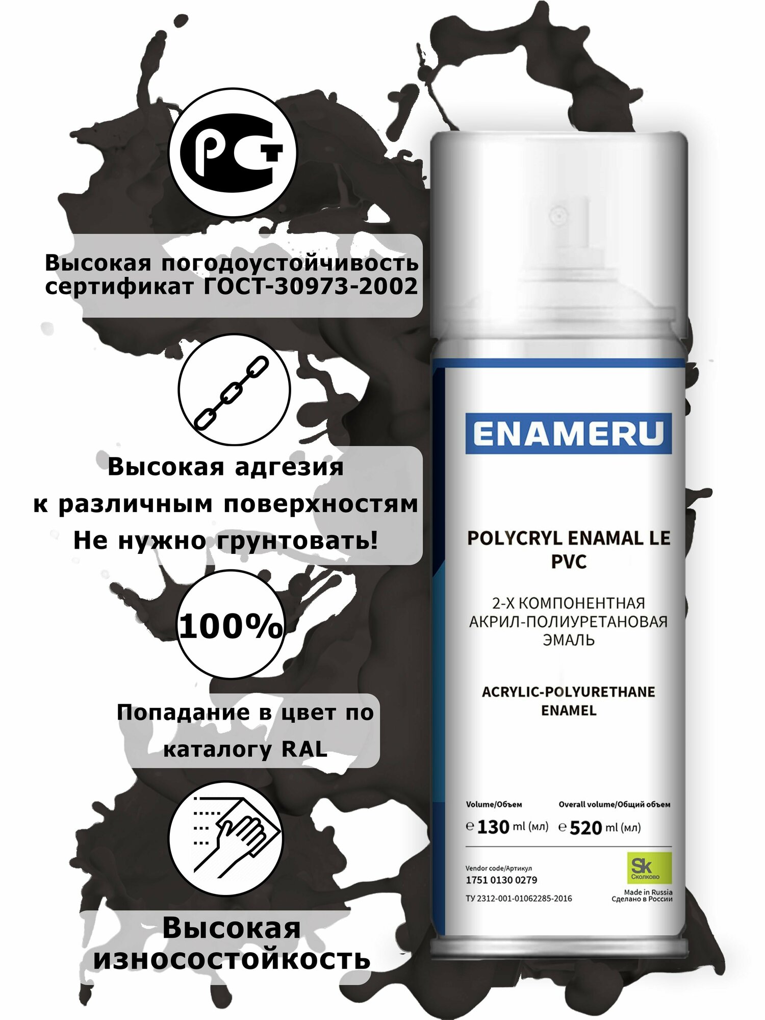 Структурная краска для ПВХ, пластика, окон Энамеру, Быстросохнущая, Акрил-полиуретановая, Полуматовая, 0.52 л, Глубокий черный RAL 9005