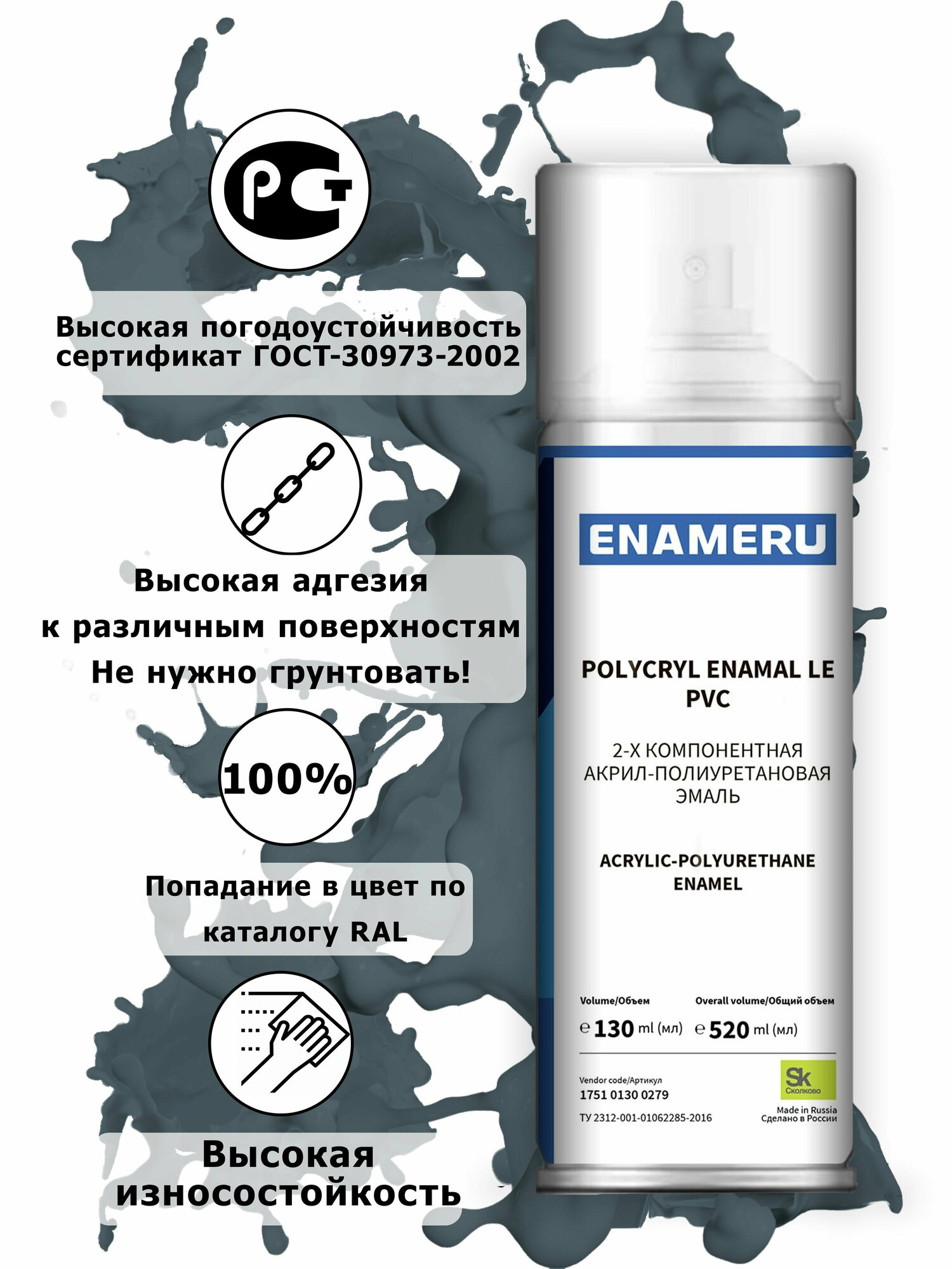 Аэрозольная краска для Стекла, Керамики Энамеру, Акрил-полиуретановая, Полуматовая, Телегрей 1 RAL 7045, 0.52л