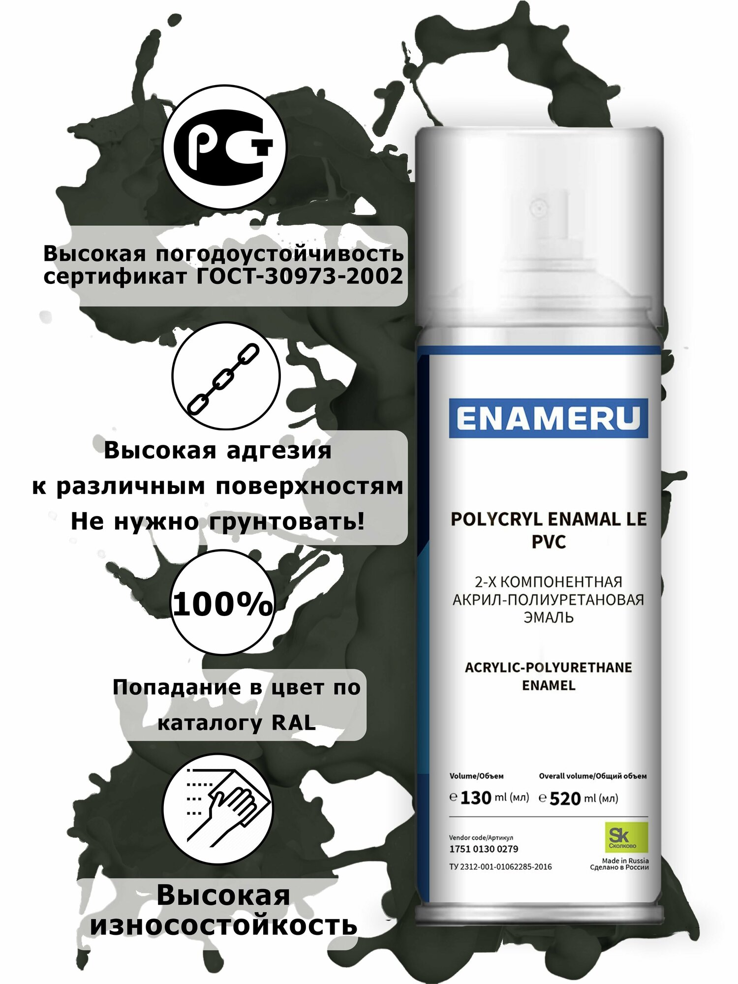 Аэрозольная краска для Стекла, Керамики Энамеру, Быстросохнущая, Акрил-полиуретановая, Полуматовая, 0.52 л, Графитовый черный RAL 9011