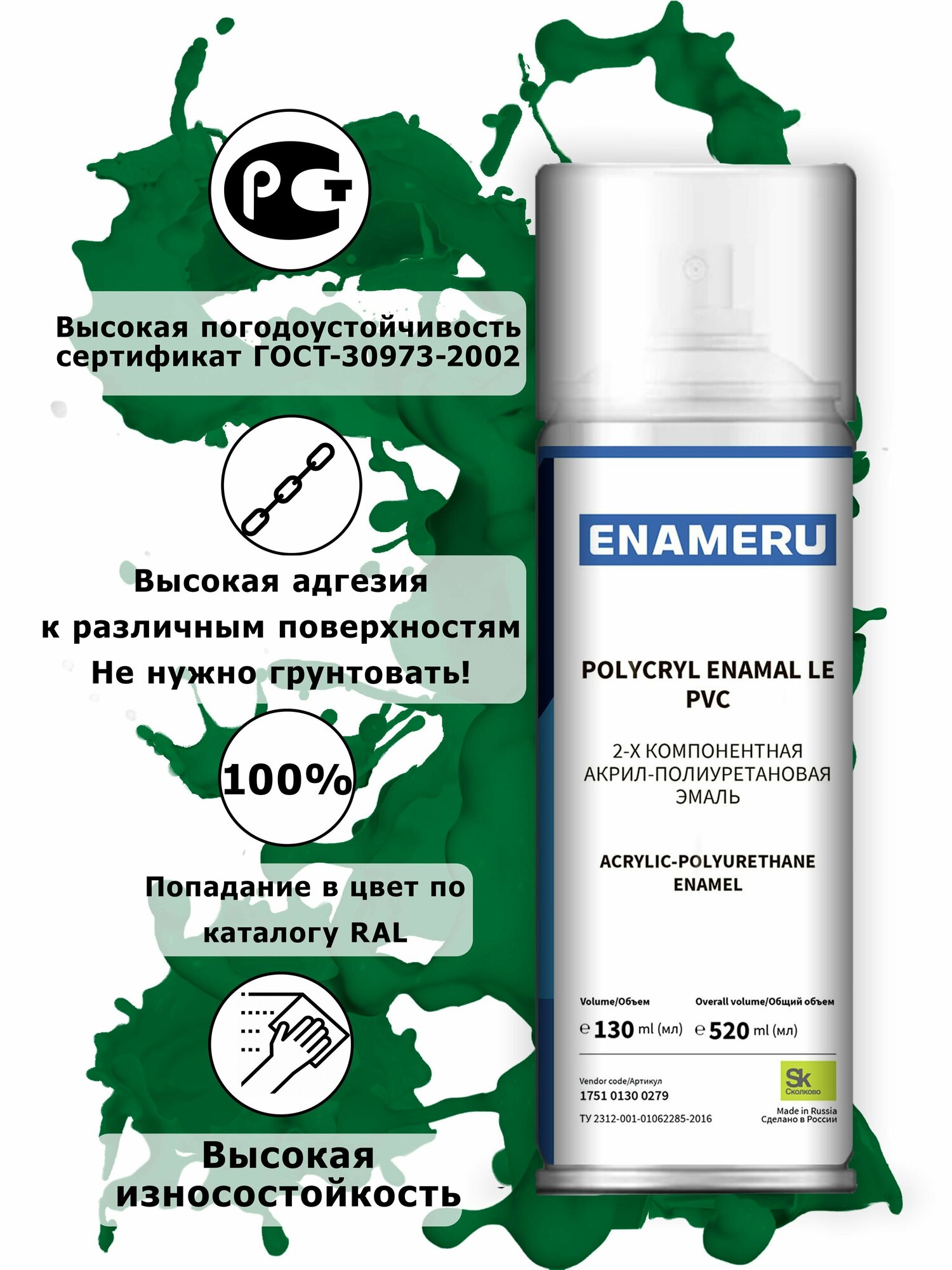 Аэрозольная краска для Стекла, Керамики Энамеру, Акрил-полиуретановая, Полуматовая, Сигнальный зеленый RAL 6032, 0.52л