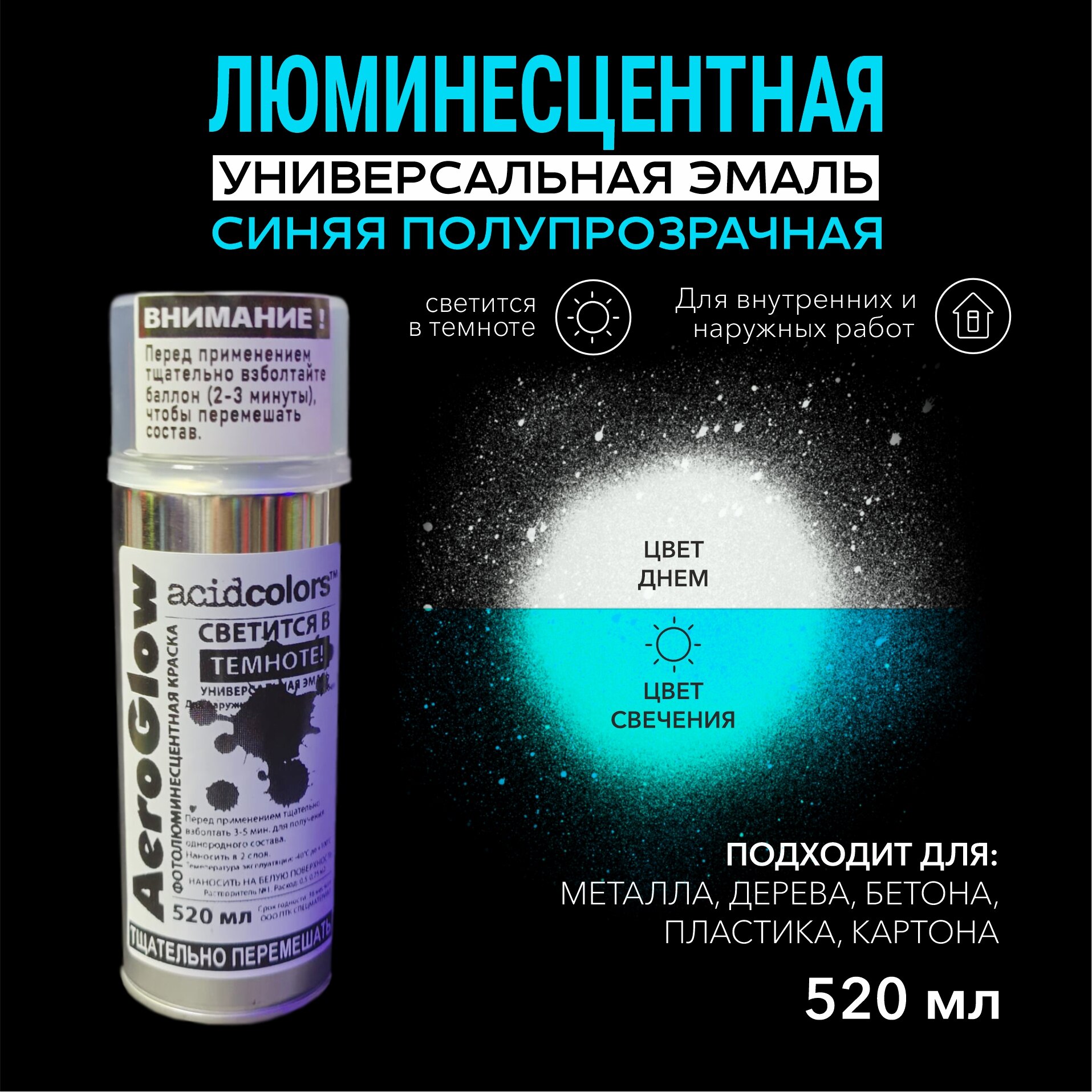 Эмаль AcidColors AeroGlow Luminescent Светящаяся люминисцентная, 520 мл, прозрачный, голубой интересное: