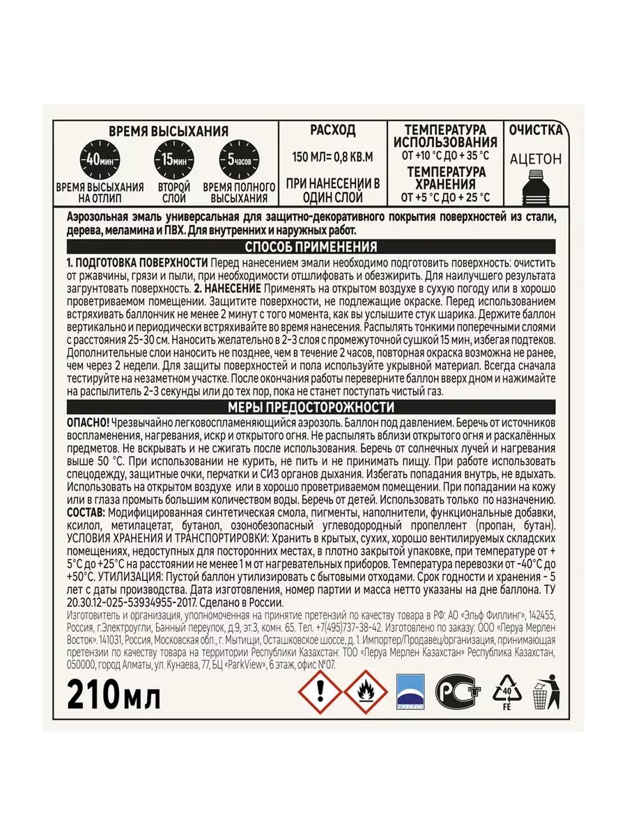 Ниже Вы можете прочитать отзывы на Эмаль аэрозольная декоративная матовая ,210 мл, ознакомится с подробными характеристиками, посмотреть интересные обзоры и фотографии на Эмаль аэрозольная декоративная матовая ,210 мл.