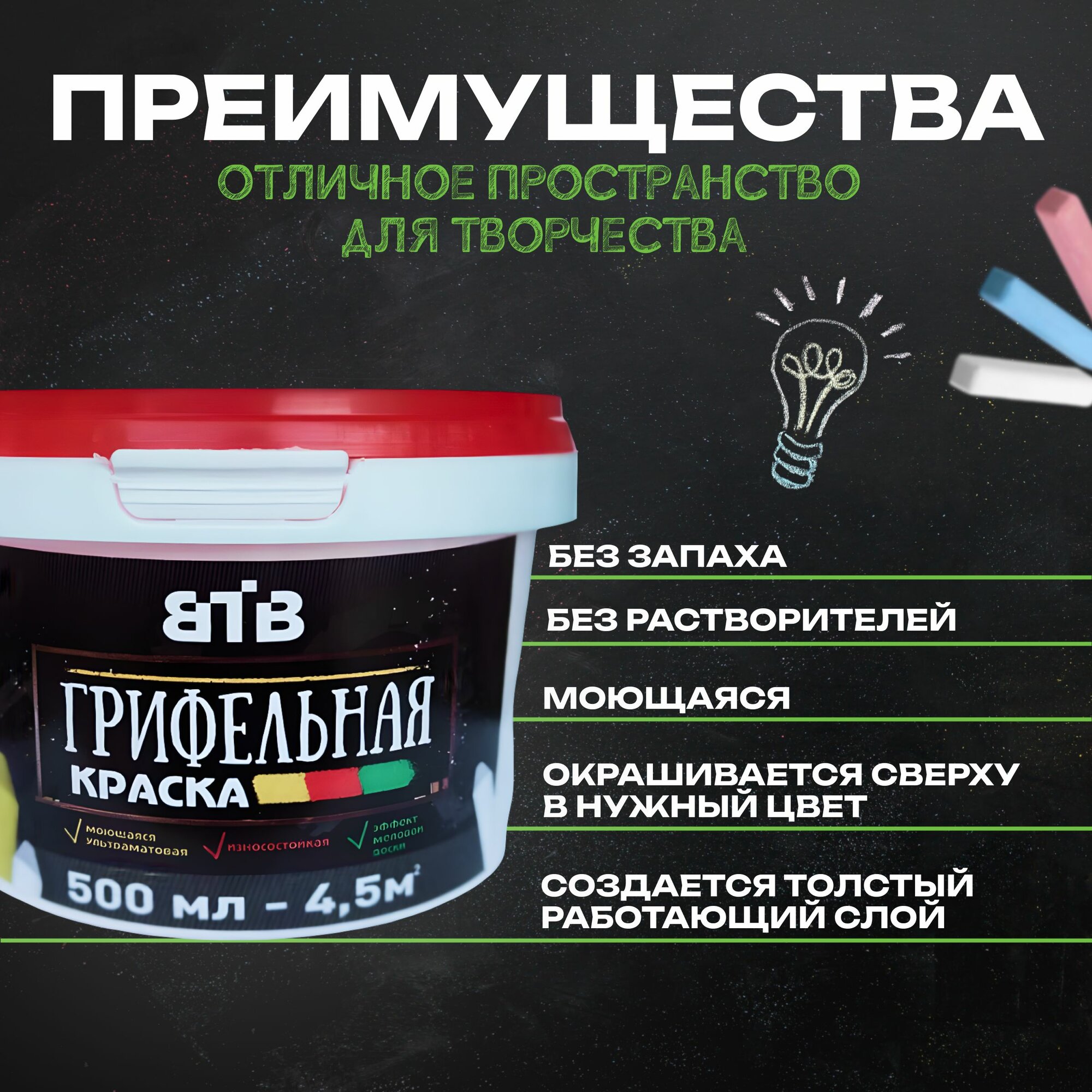 Ниже Вы можете прочитать отзывы на Грифельная краска черная ВТВ с эффектом школьной меловой доски, 0,5 л, черный, для стен, для интерьера и декора, ознакомится с подробными характеристиками, посмотреть интересные обзоры и фотографии на Грифельная краска черная ВТВ с эффектом школьной меловой доски, 0,5 л, черный, для стен, для интерьера и декора.