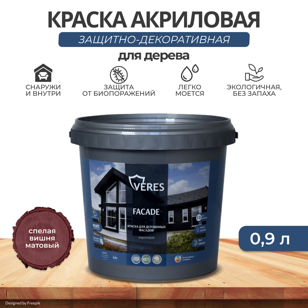 Краска для деревянных фасадов Veres Facade, акриловая, матовая, 9 л, спелая вишня