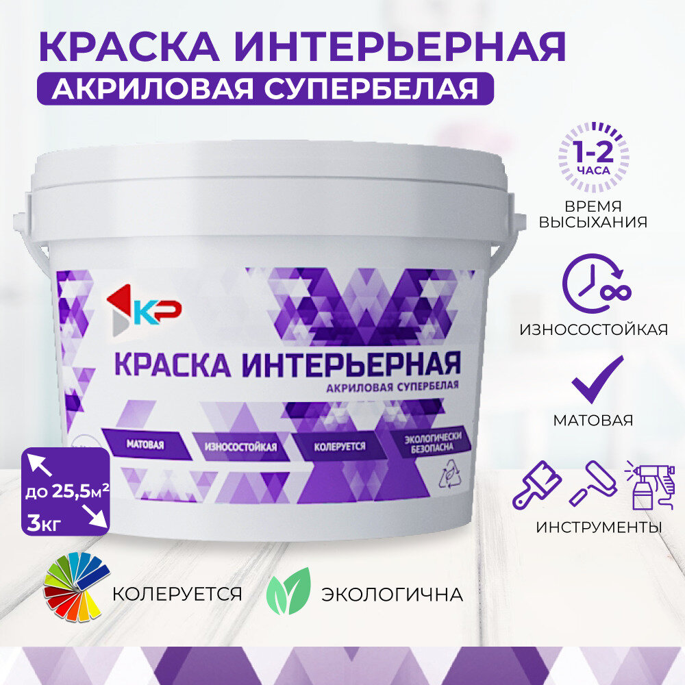 Купить Краска КР интерьерная Быстросохнущая, Акриловая, Матовое покрытие, 3 кг, супербелая