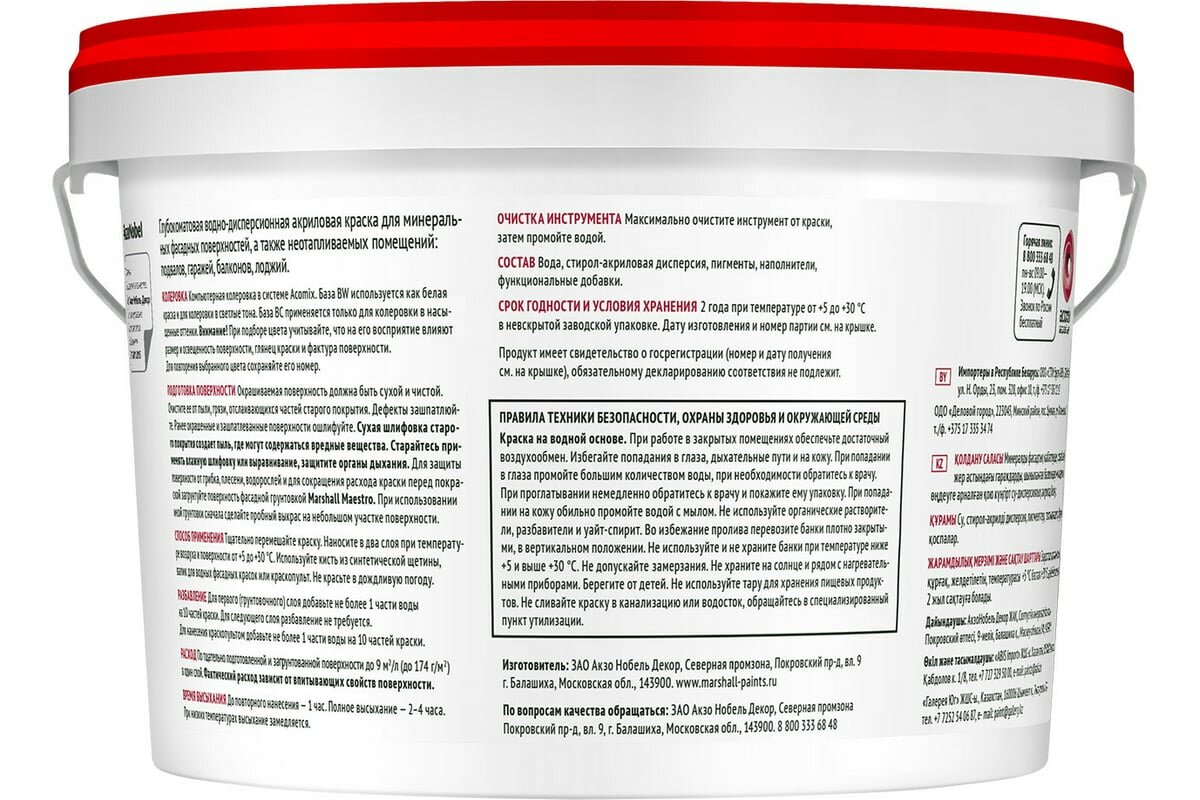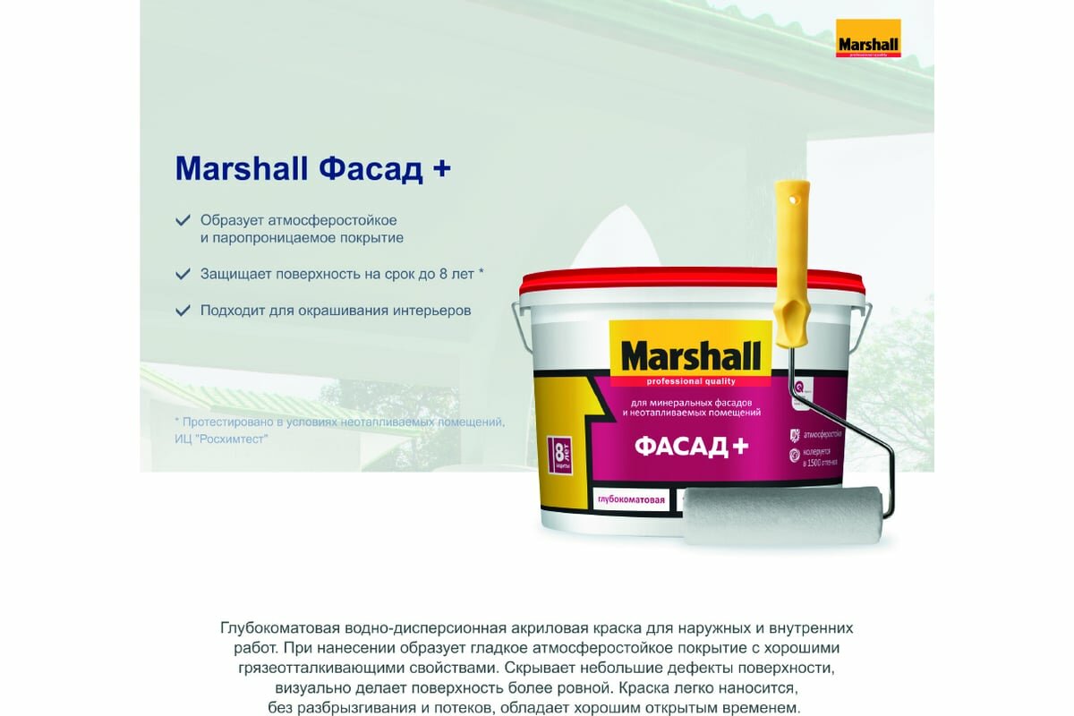 Краска фасадная акриловая водно-дисперсионная Marshall Фасад+ глубокоматовая база BW 9 л. интересное: