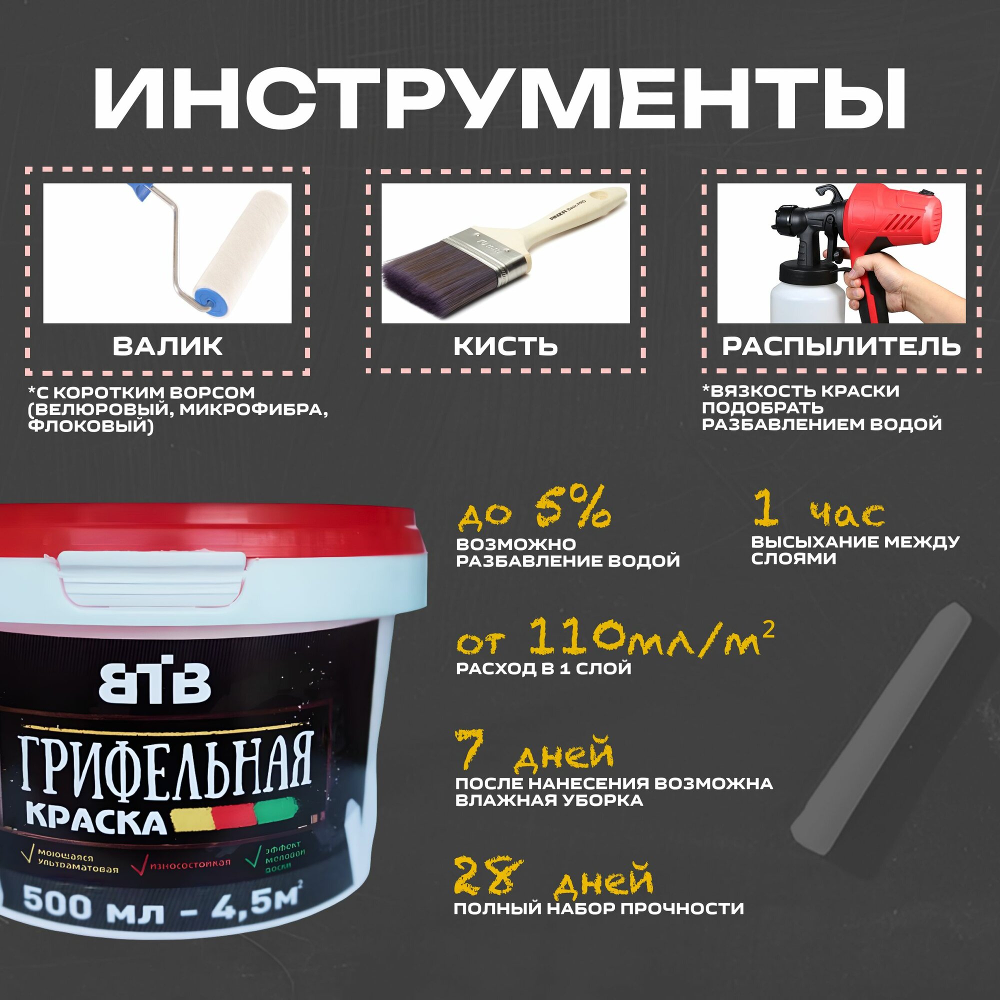 СохранитьГрифельная краска ВТВ с эффектом школьной меловой доски, 0,5 л, серая, для стен, для интерьера и декора интересное: