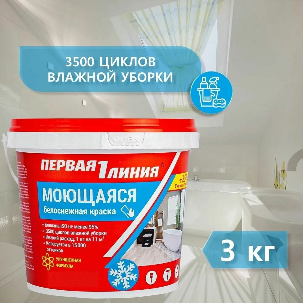 Купить Краска моющая Первая линия быстросохнущая, акриловая, белоснежная 3 кг