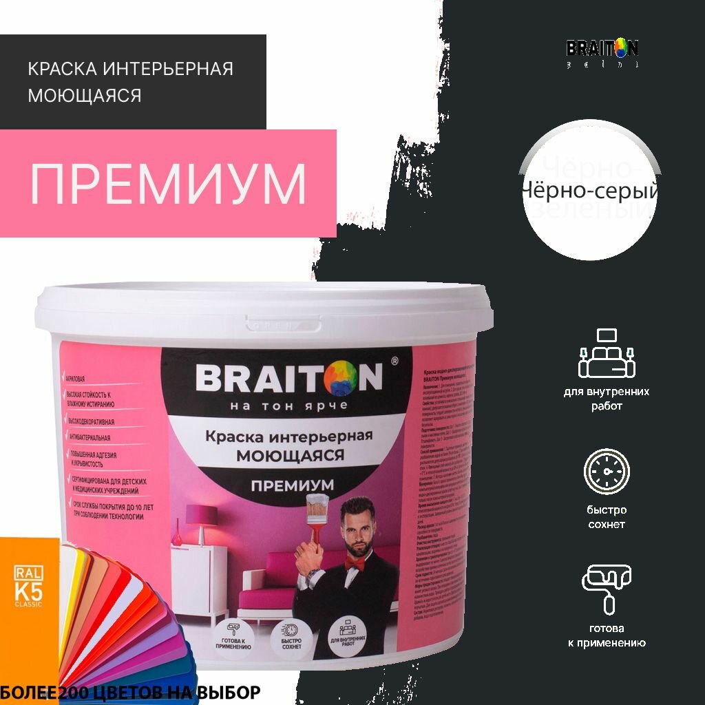 Краска ВД интерьерная BRAITON Премиум Моющаяся 4 кг. Цвет Темный графит RAL 7024