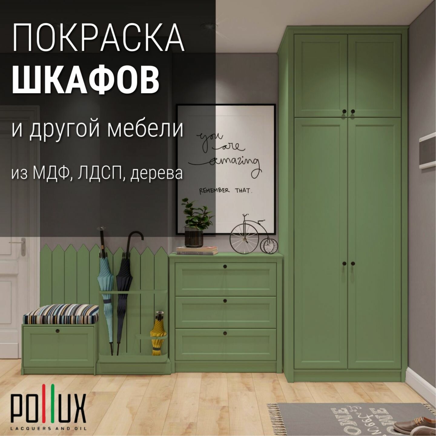 Краска для мебели без запаха матовая быстросохнущая для кухни / дерева / декора акриловая Pollux Decor Matt, объем 0,25л, цвет зелёный мох (RAL 6005)
