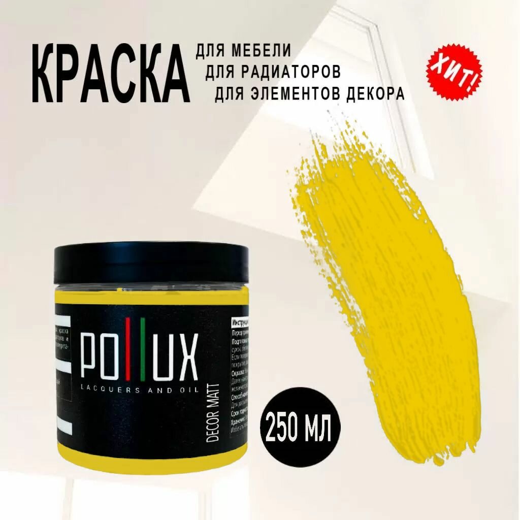 Краска для мебели / кухни / радиаторов акриловая без запаха быстросохнущая матовая Pollux Decor Matt, объем 0,25л, цвет рапсово-желтый (RAL 1021)
