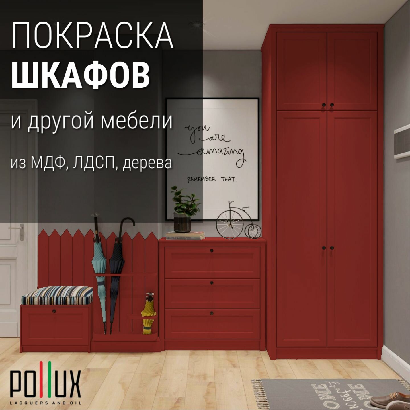 Краска для мебели без запаха матовая быстросохнущая для кухни / дерева / декора акриловая Pollux Decor Matt, объем 0,5л, цвет сигнальный красный (RAL 3001)