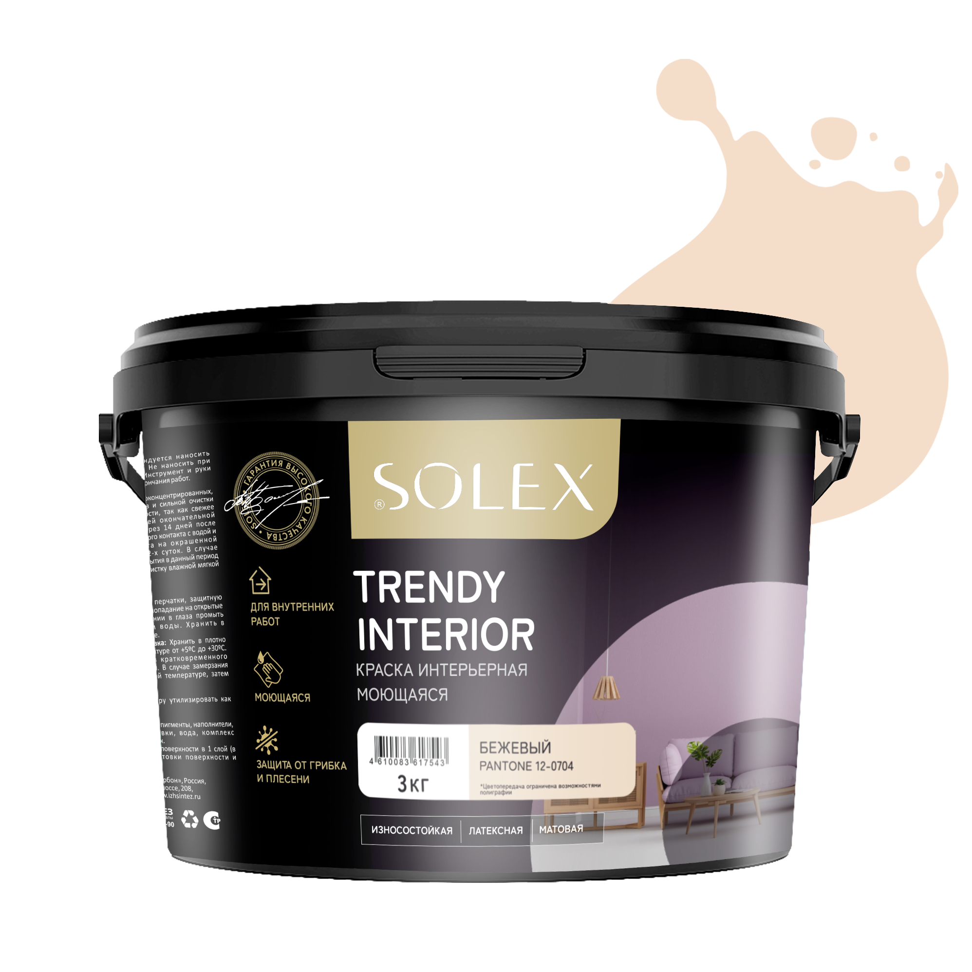 Купить Краска для стен и обоев интерьерная моющаяся, TRENDY INTERIOR, SOLEX - бежевый (3 кг.)